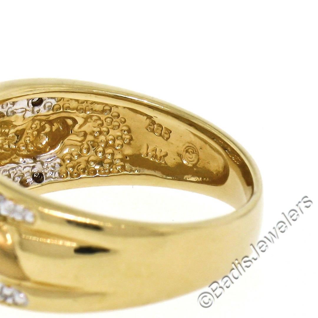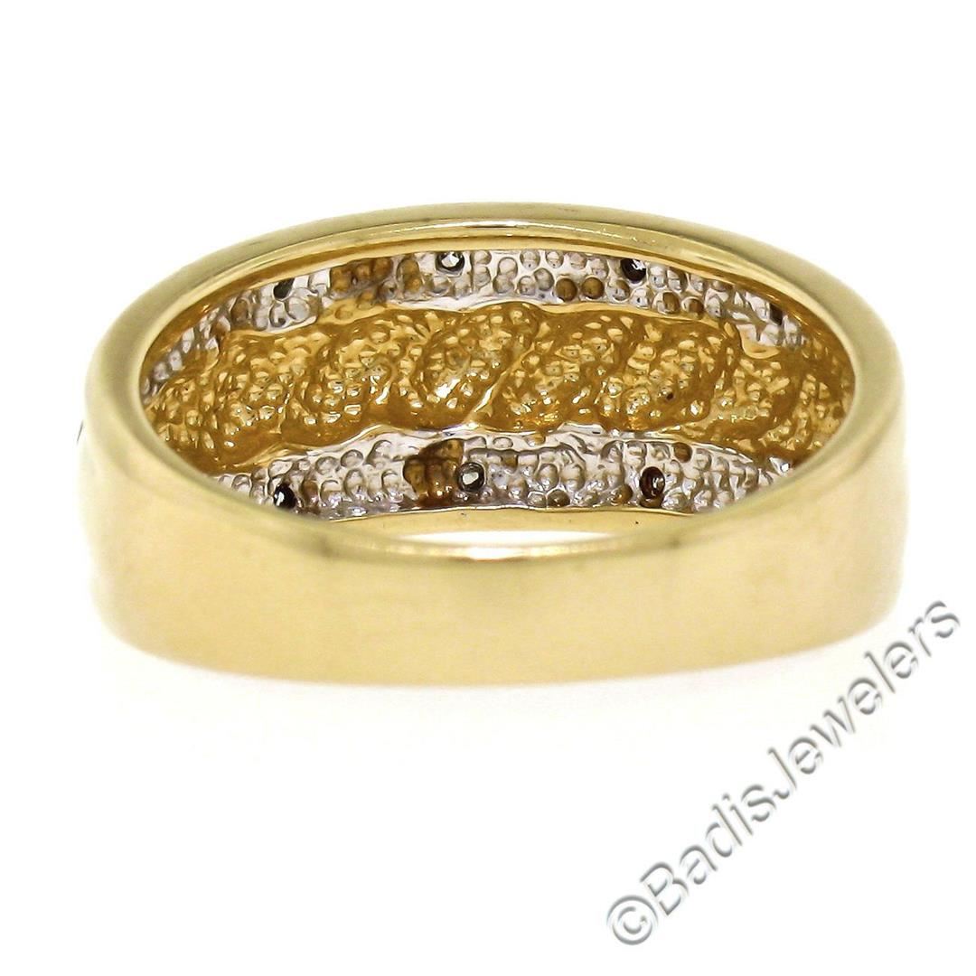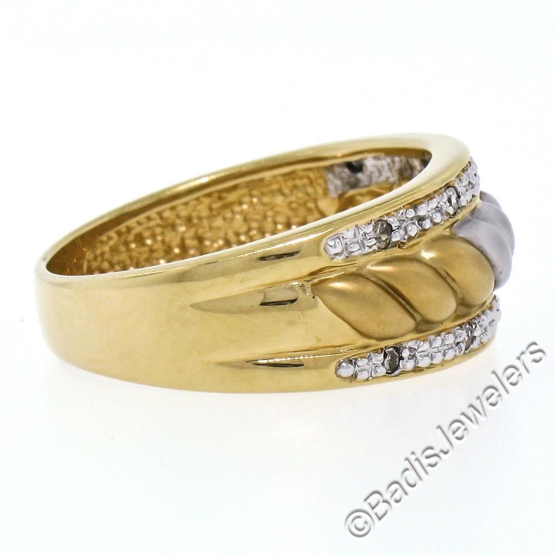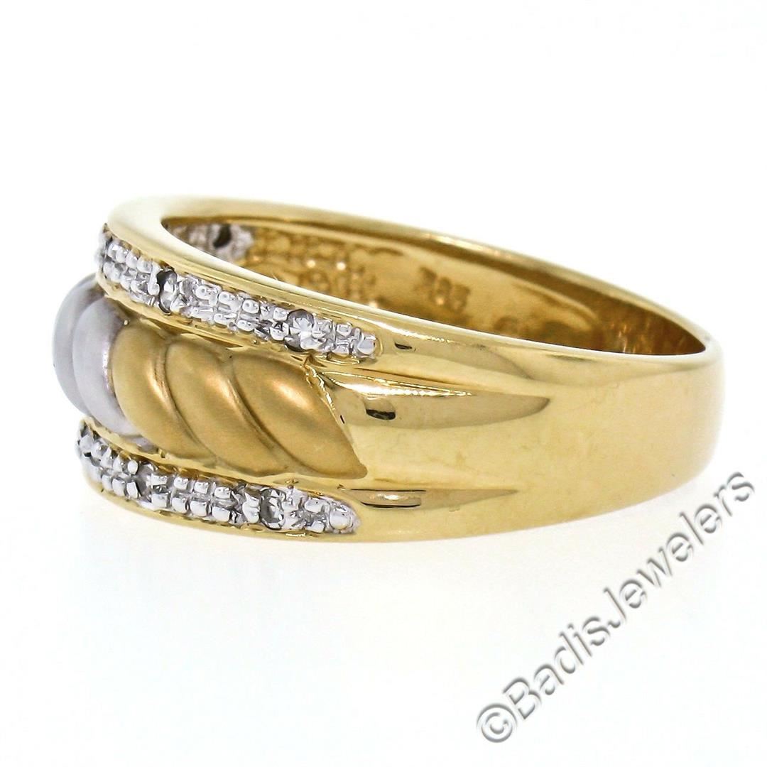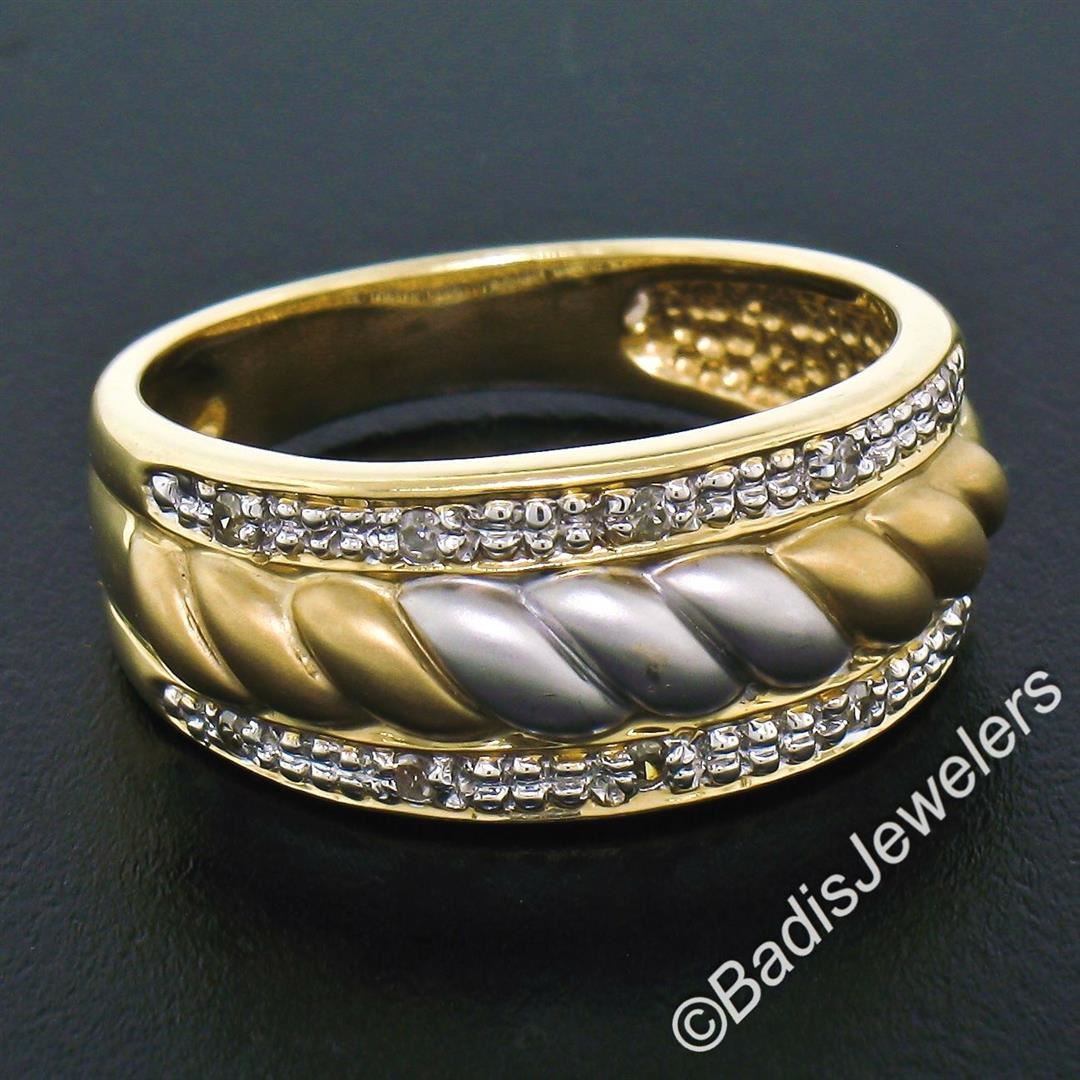 An excellent condition 14kt yellow and white gold band ring with 0.05ctw of round single cut diamonds (I - SI2). The ring is size 7, weighs a total of 4.89 grams, and measures approximately 8.60mm wide.