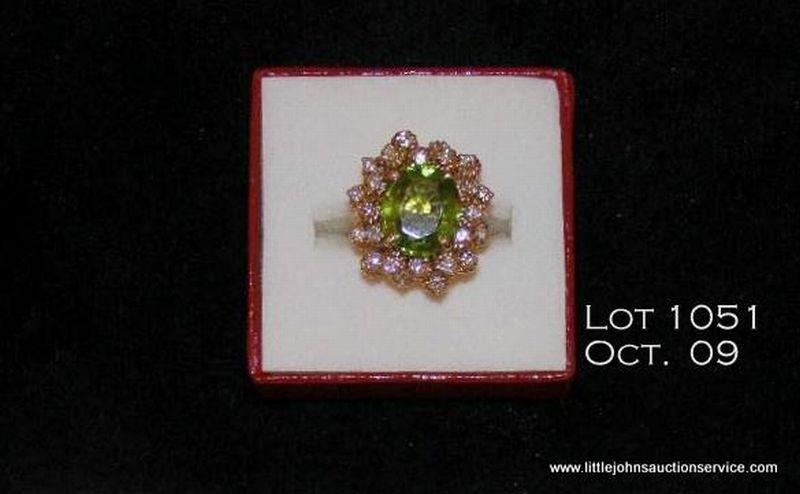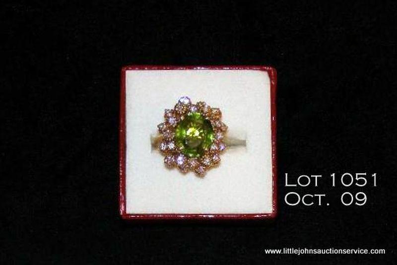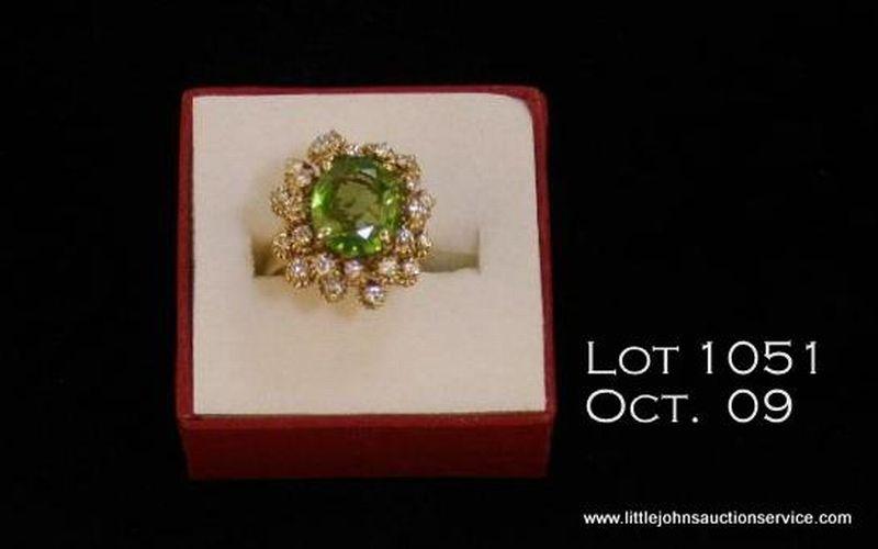 14kt Yellow gold peridot, diamond ring, 10 grams. Oval peridot weighing approx. 5.33 carats further inhanced with 24 full cut diamonds having an estimated total weight of approx. 3/4 carat. Est. $325 - $650