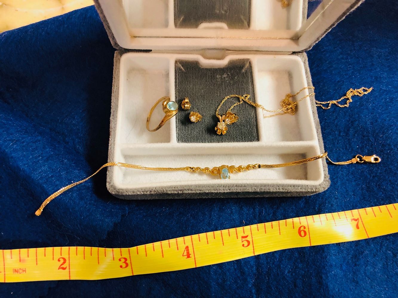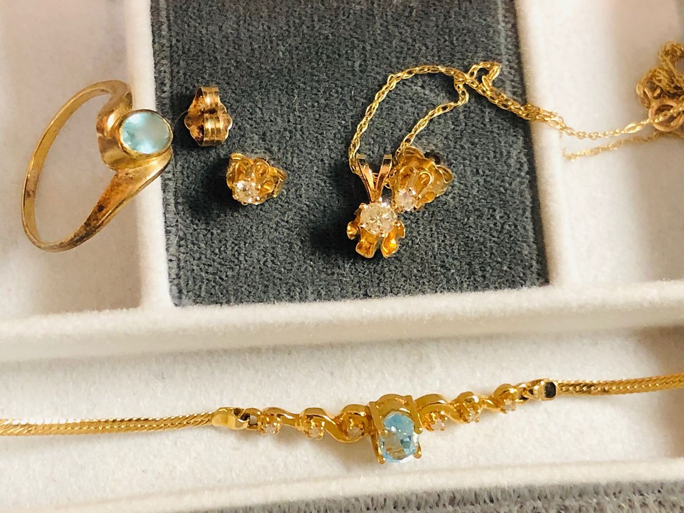 14kt Gold and diamond earrings and pendant, 14kt gold bracelet with aquamarine, 10k ring with aquamarine.