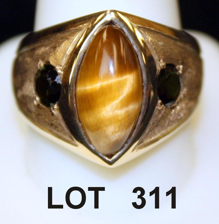 14kt custom man’s ring, set with tiger eye center and two accenting dark green stones on each side, unidentified. An intriguing gent’s ring. Est: $1000 - $2,000