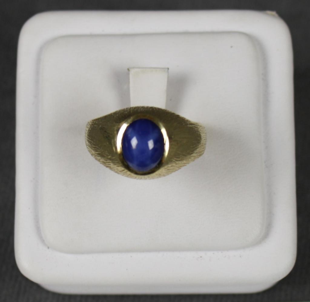 14kt gypsy style mans ring set with a lindy  star sapphire. Est. $700-$1,400.