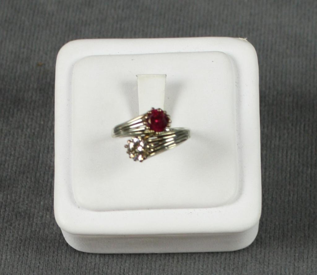 14kt white gold ladies art deco ring set with  a round diamond approx 0.75ct and an approx  1ct round ruby. Est. $2,500-$5,000.