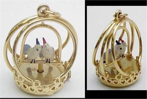 14kt yellow gold bird cage pendant. Pendant has two enameled cockatiels sitting on a perch that twirls around when wound. 13.2gr