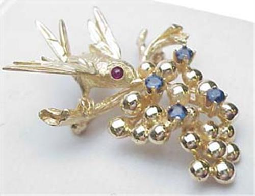 14kt yellow gold pin bird on branch with sapphires and ruby 10.3gr signed Napier