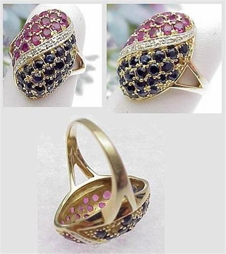 14kt yellow gold ruby diamond and sapphire dome ring missing one sapphire. 5.6gr finger size 4 1/2