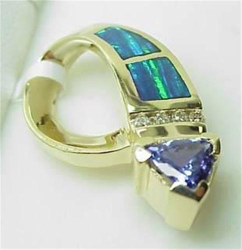 14kt yellow gold slide pendant with created opal, trillion cut tanzanite .59Ct and diamonds .07Ctw