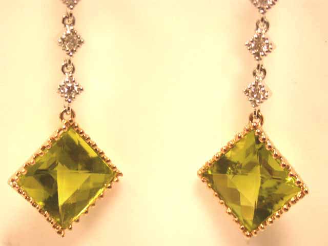 14k White Gold Earrings w/ Diamonds - 0.12 carat, G color and VS clarity and Peridot - 5.1 carats Length - approximately 1.5 inches long