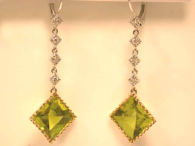 14k White Gold Earrings w/ Diamonds - 0.12 carat, G color and VS clarity and Peridot - 5.1 carats Length - approximately 1.5 inches long