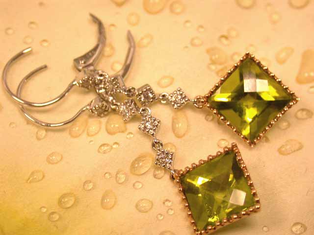 14k White Gold Earrings w/ Diamonds - 0.12 carat, G color and VS clarity and Peridot - 5.1 carats Length - approximately 1.5 inches long
