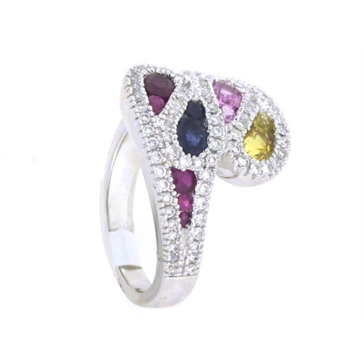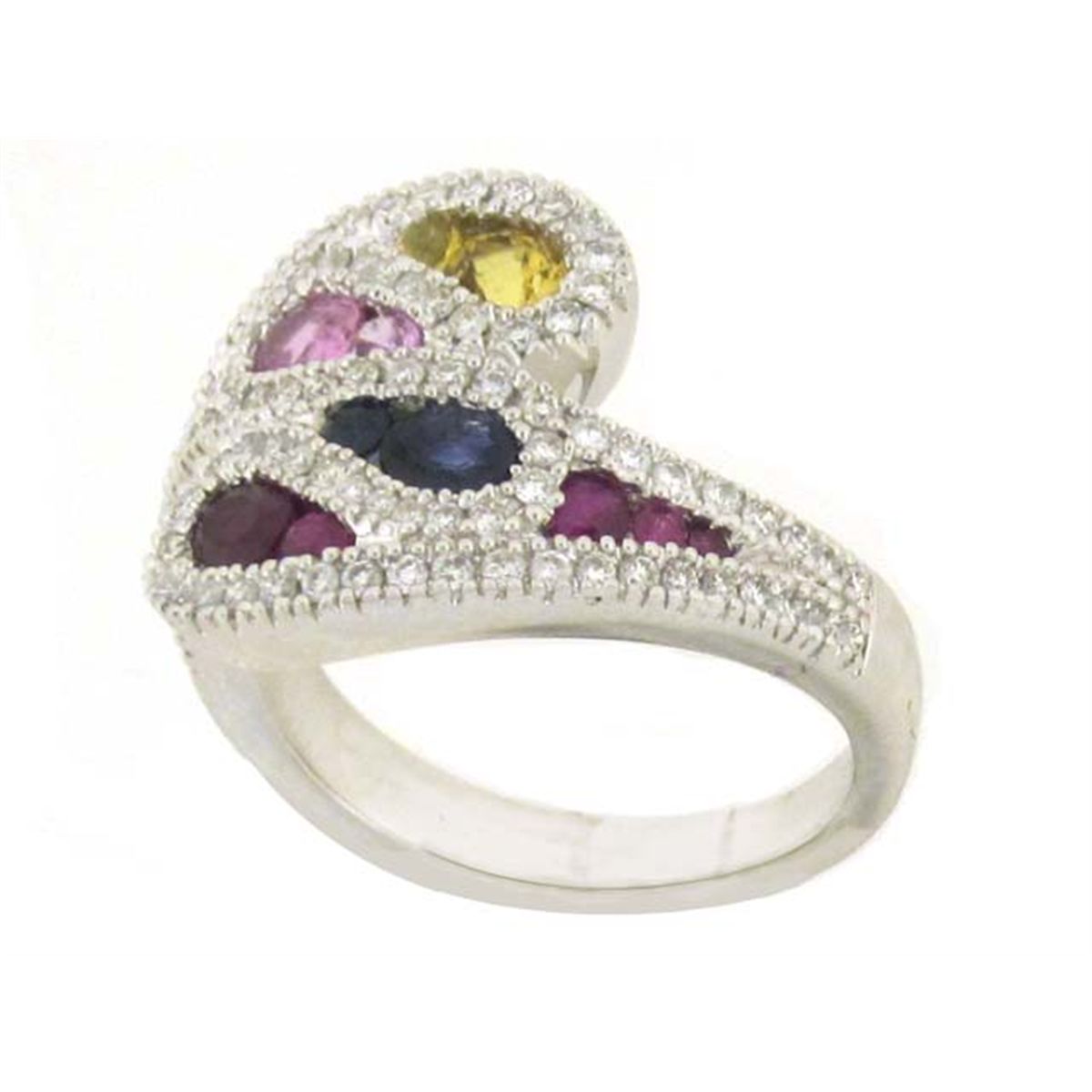 14k White Gold Ring with Diamonds - 0.63 carat, round cut, G color and VS clarity and Multi-colored Gemstones - 1.34 carats (Rubies, Sapphires and Topaz). The ring size is 7 and weighs 7.2 grams