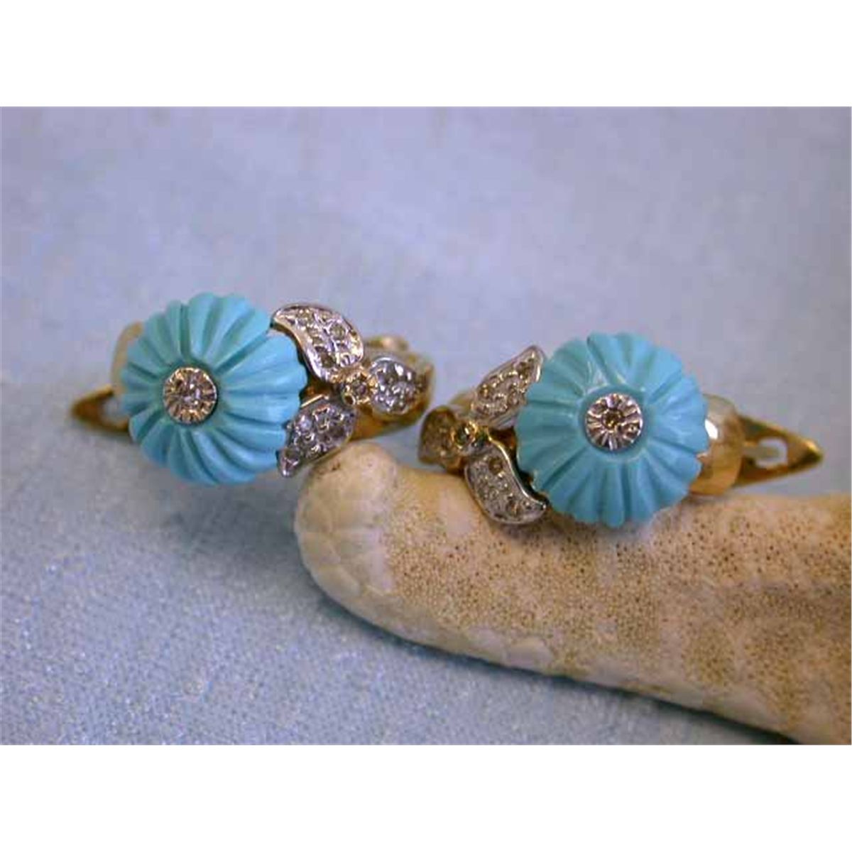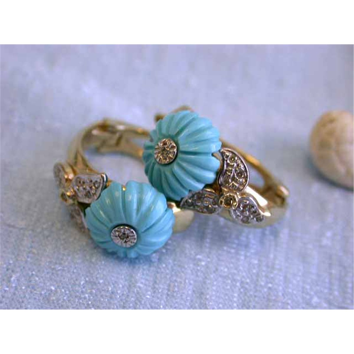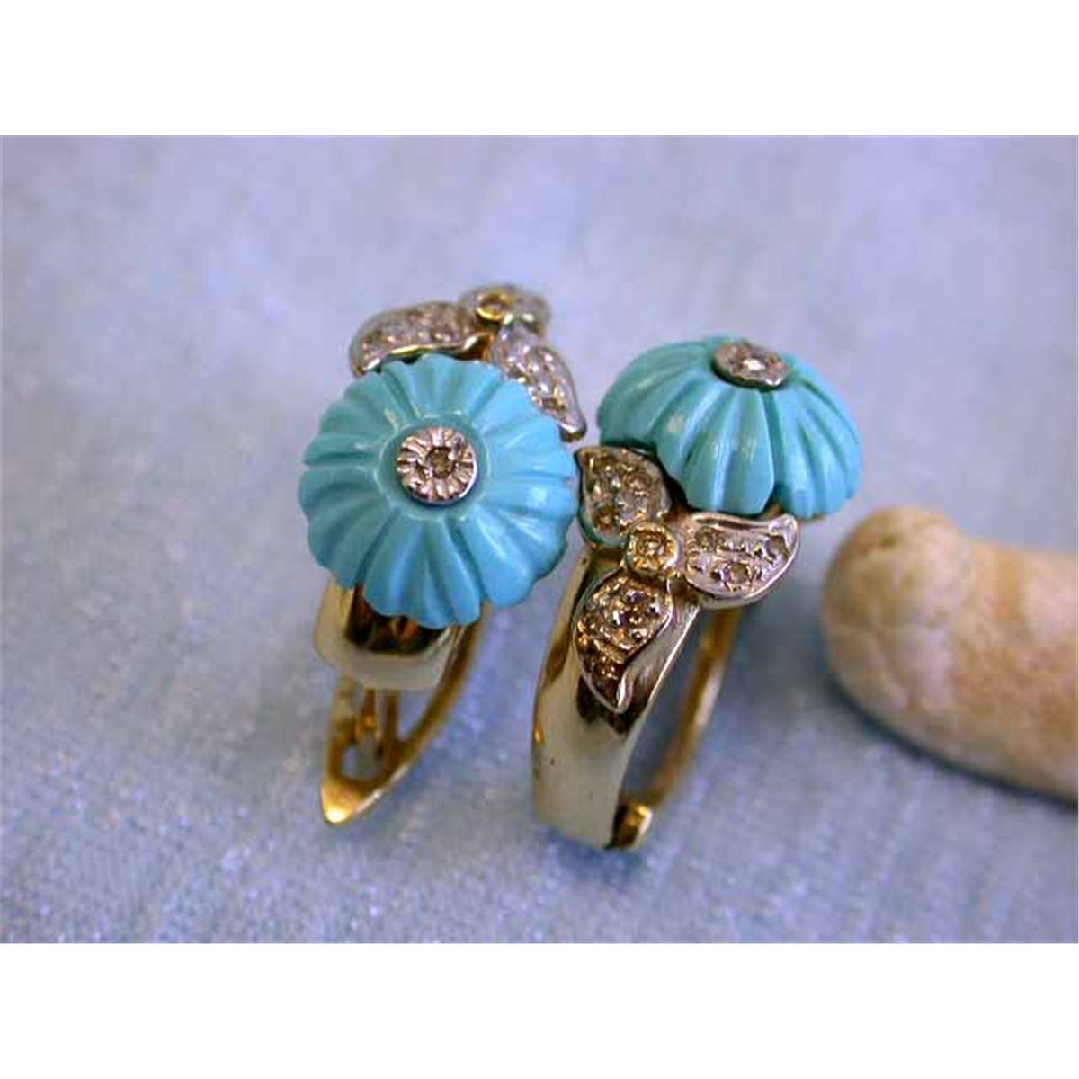 14k Yellow Gold Earrings with Turquoise and Diamonds; Weight – 6.3 grams