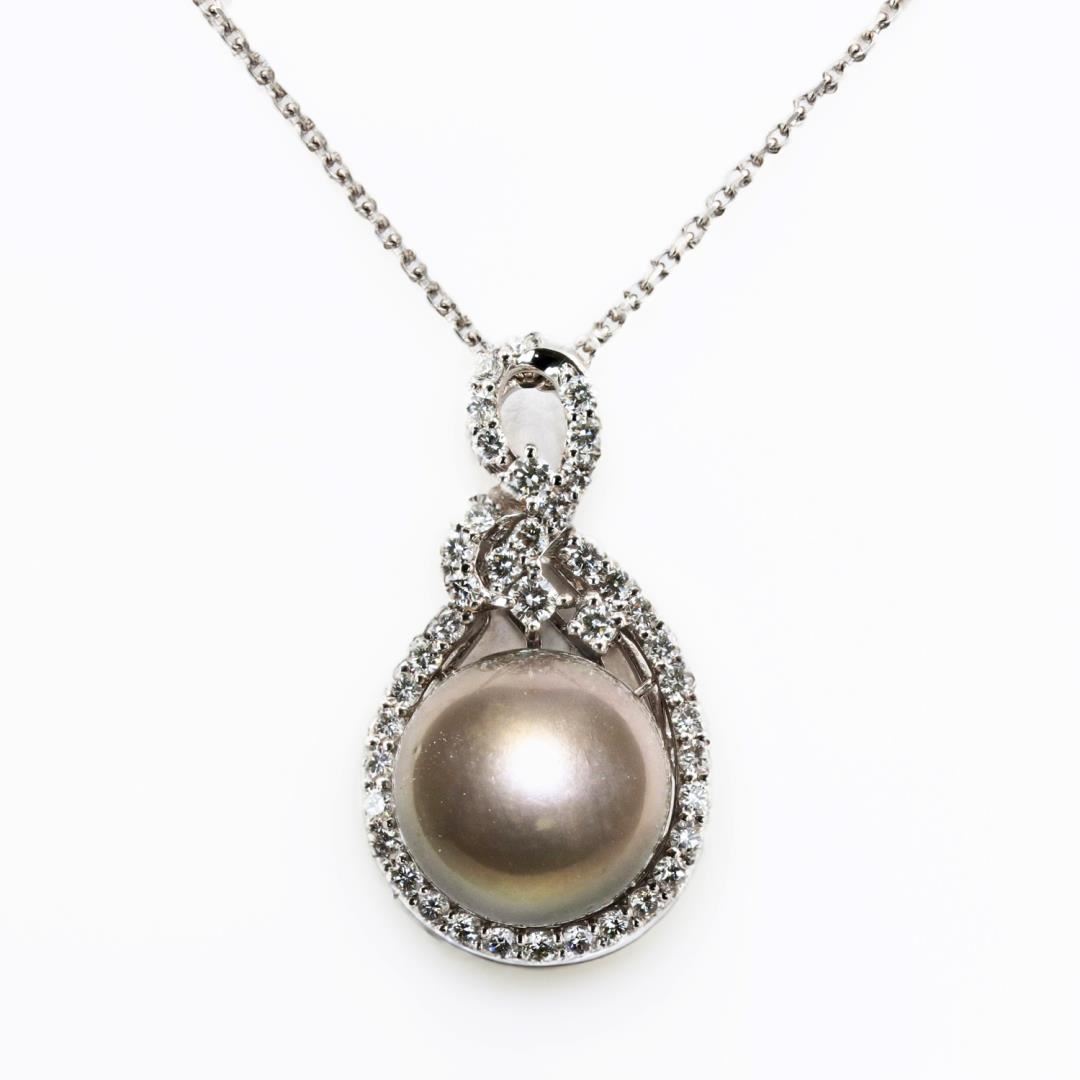 One polished, stamped, and tested platinum pendant mounted with: 1 genuine cultured Tahitian Pearl, and 41 genuine round diamonds weighing approximately 1.07 carats. The pendant hangs from a platinum link chain measuring 20 inches in length. This item weighs 15.1 grams, condition is new, excellent workmanship. #MAIN GEMSTONE# Identity: Tahitian Pearl Species: Cultured Pearl Shape: Round Measurements: 14mm Body Color: Dark Gray Overtone: Pink Luster: Excellent Surface Grade: Very Lightly Spotted Refractive Index: 1.530 - 1.685 DR Birefringence: 0.15 Specific Gravity: 2.72 - 2.78 #ADJACENT GEMSTONES ON PENDANT# Identity: Natural Diamond Shape: Round Cutting Style: Brilliant Cut Quantity: 41 Diamonds Measurements: 1.7 - 2.3mm Total Weight: 1.07 carat Clarity Grade: VS1 - SI1 Color Grade: G - H Refractive Index: 2.418 Hardness: 10 TAHITIAN PEARL: 14mm TOTAL DIAMOND WEIGHT: 1.07 cts WEIGHT OF ITEM: 15.1 grams METAL: Platinum