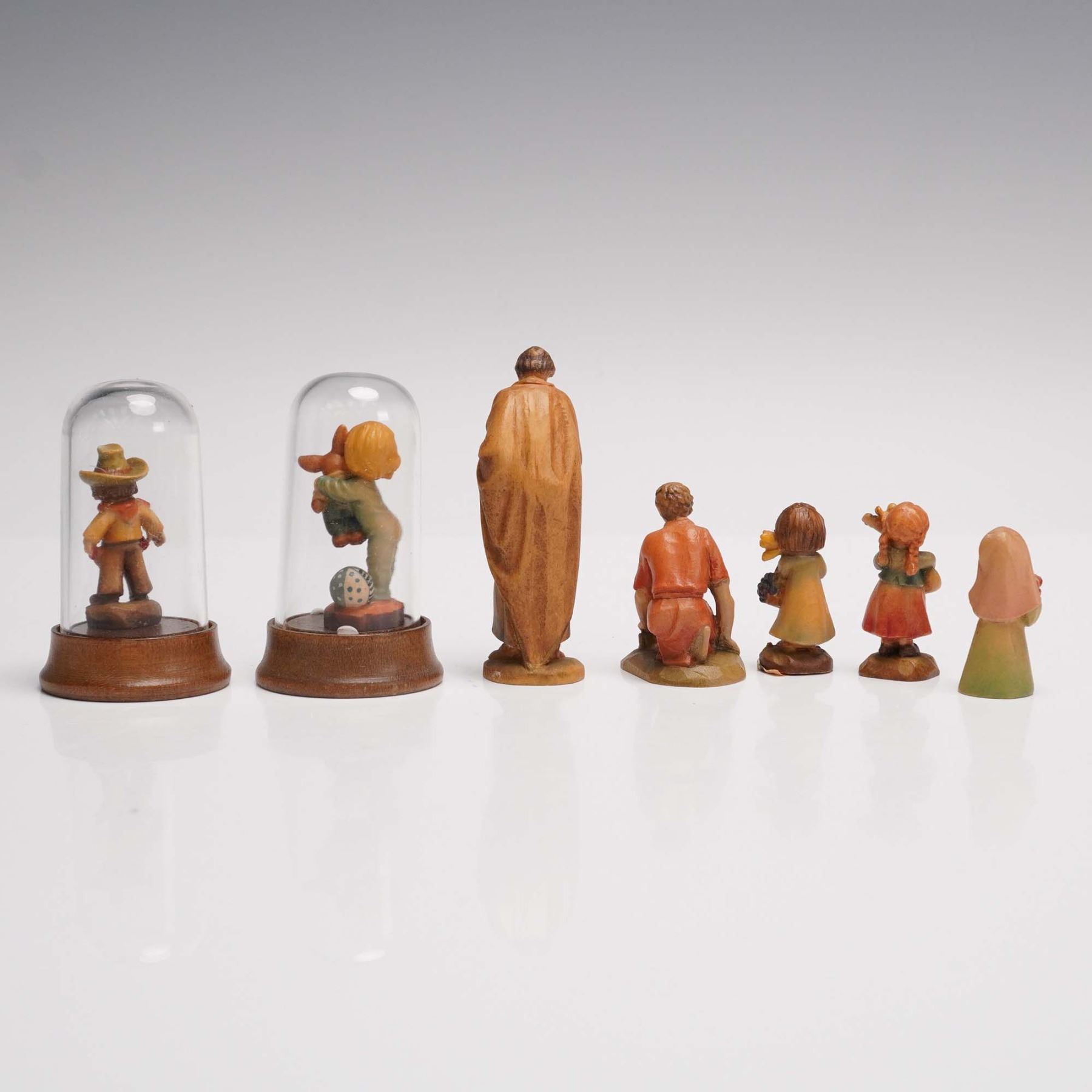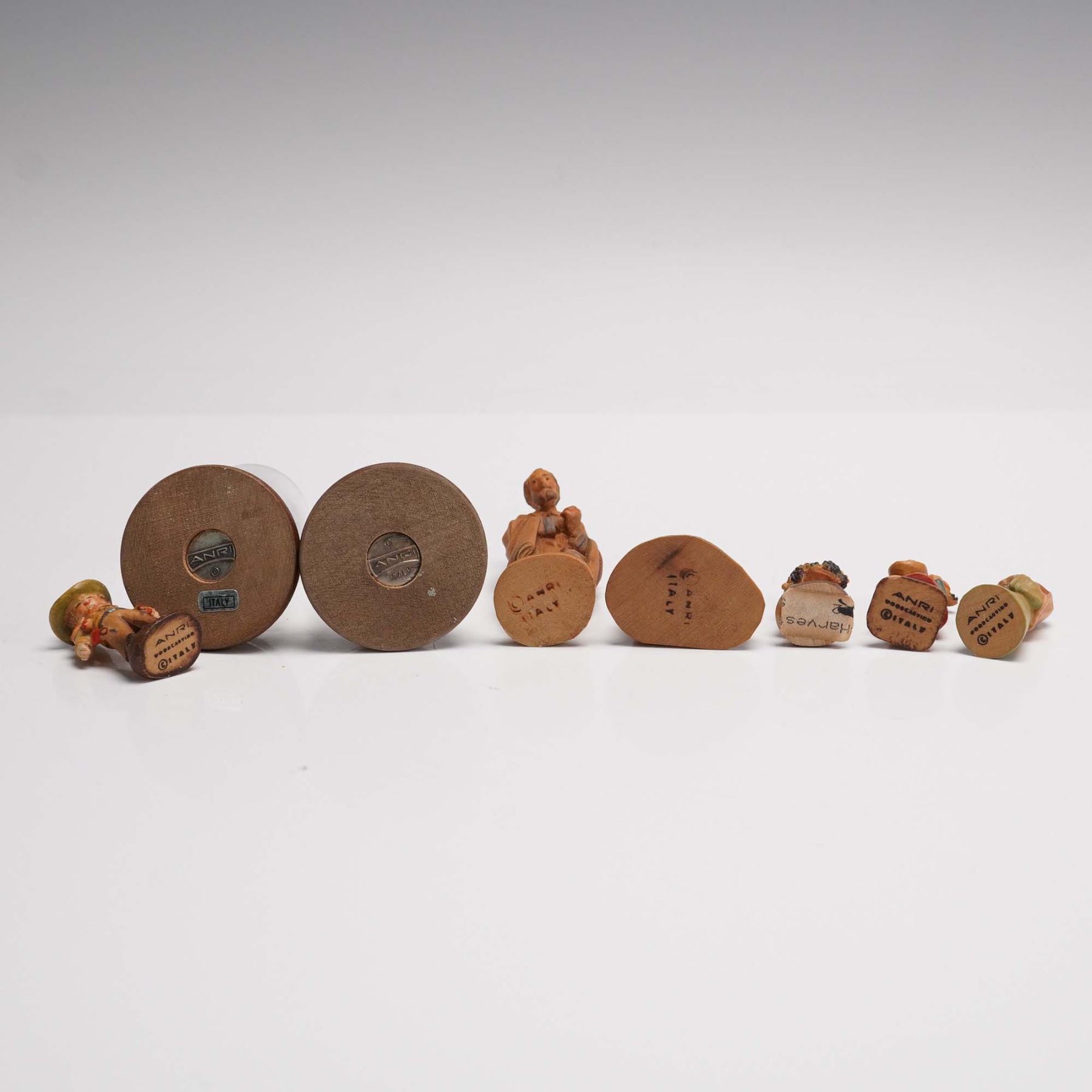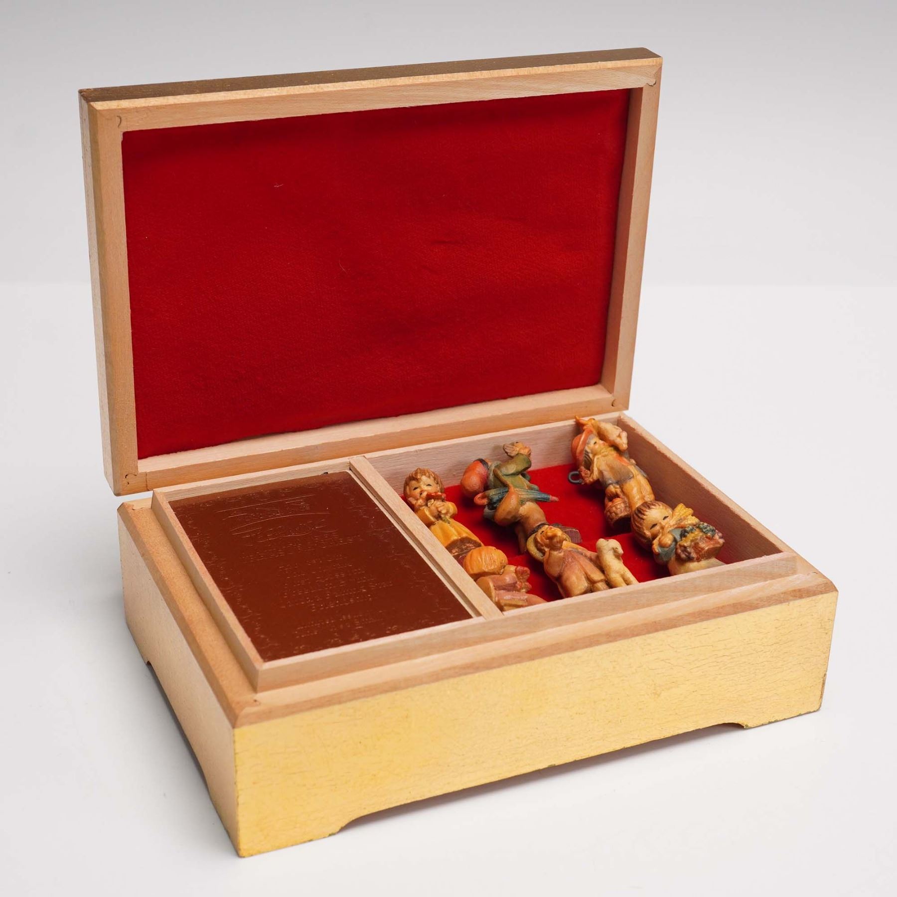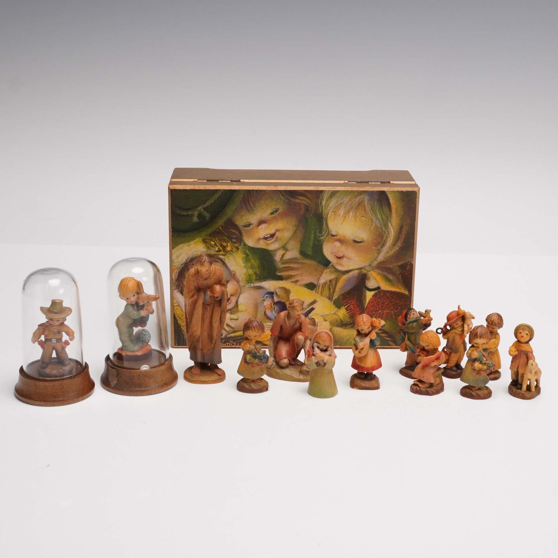Charming collection of hand carved and painted miniature wooden figurines by ANRI Italy, housed in a gold tone musical treasure chest. The set features various heartwarming scenes of children and people with animals, musical instruments, and seasonal themes. The chest lid is adorned with a colorful image of children and birds. Inside, the figures are presented in a red velvet lined compartment, with a golden plaque. Includes 13 individual miniatures, two under glass domes, all stamped ANRI Italy. A delightful ensemble celebrating ANRIs craftsmanship and sentimental artistry. ANRI backstamp.