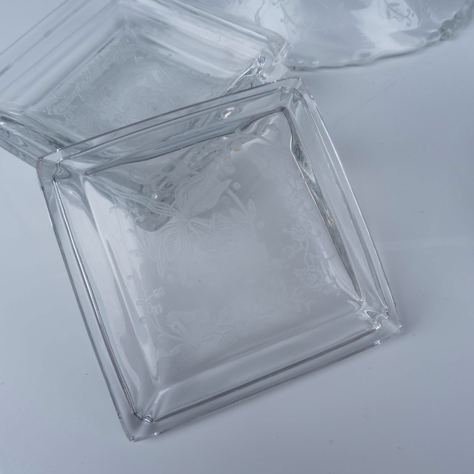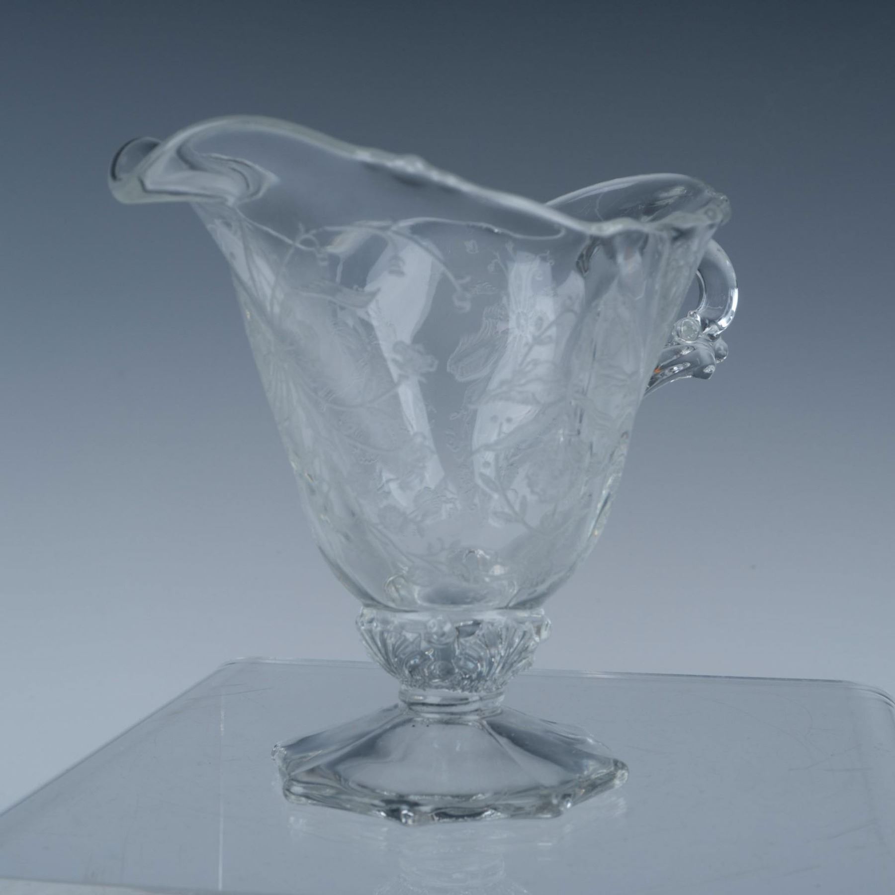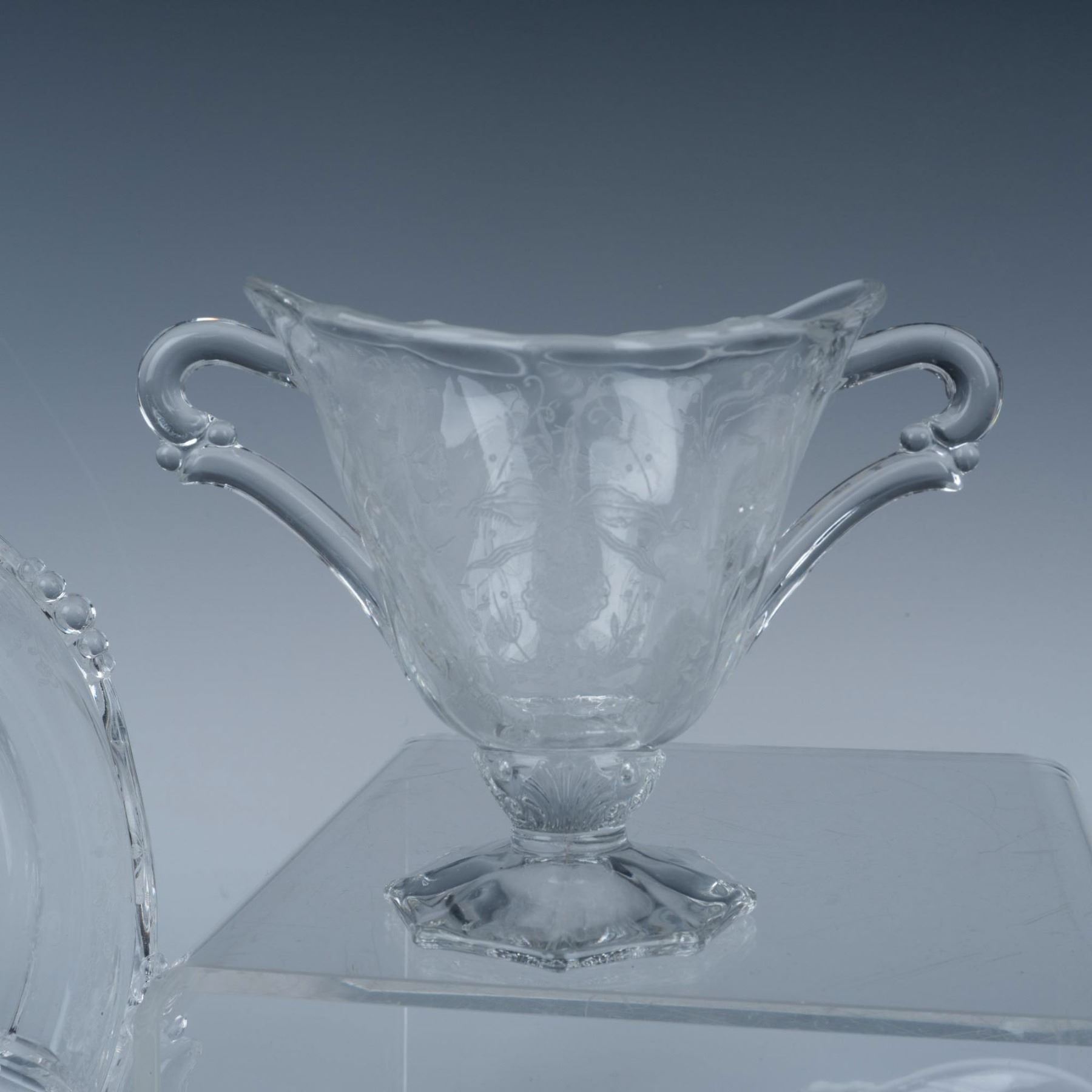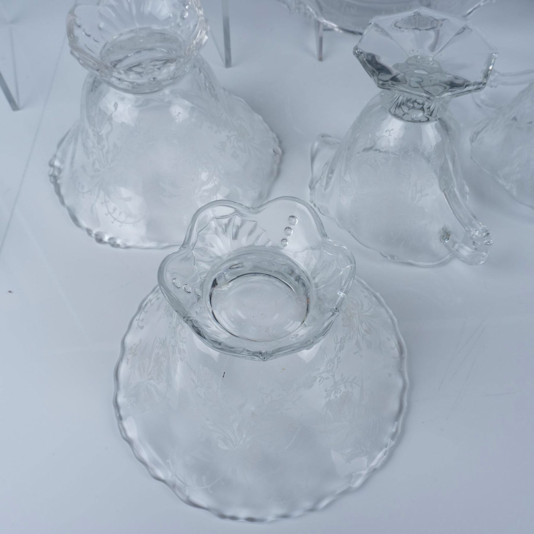 This beautiful 14-piece Heisey Orchid set features elegant and timeless pieces, each adorned with the intricate Orchid pattern. The collection includes: a footed mint bowl (5"H), a short stem compote (6"H), a cheese compote (2.5"H), a 3-part relish dish (7.5" dia.), a bowl with graceful dolphin feet (7.5" dia.), a creamer and sugar set with pedestal feet (both 4"H), two mayonnaise bowls (3.75"H) with 2 matching underplates (7.5" dia.), and three charming small square salt cellars (3"W x 3"L). This set exemplifies the refined craftsmanship of Heisey's elegant glassware.
