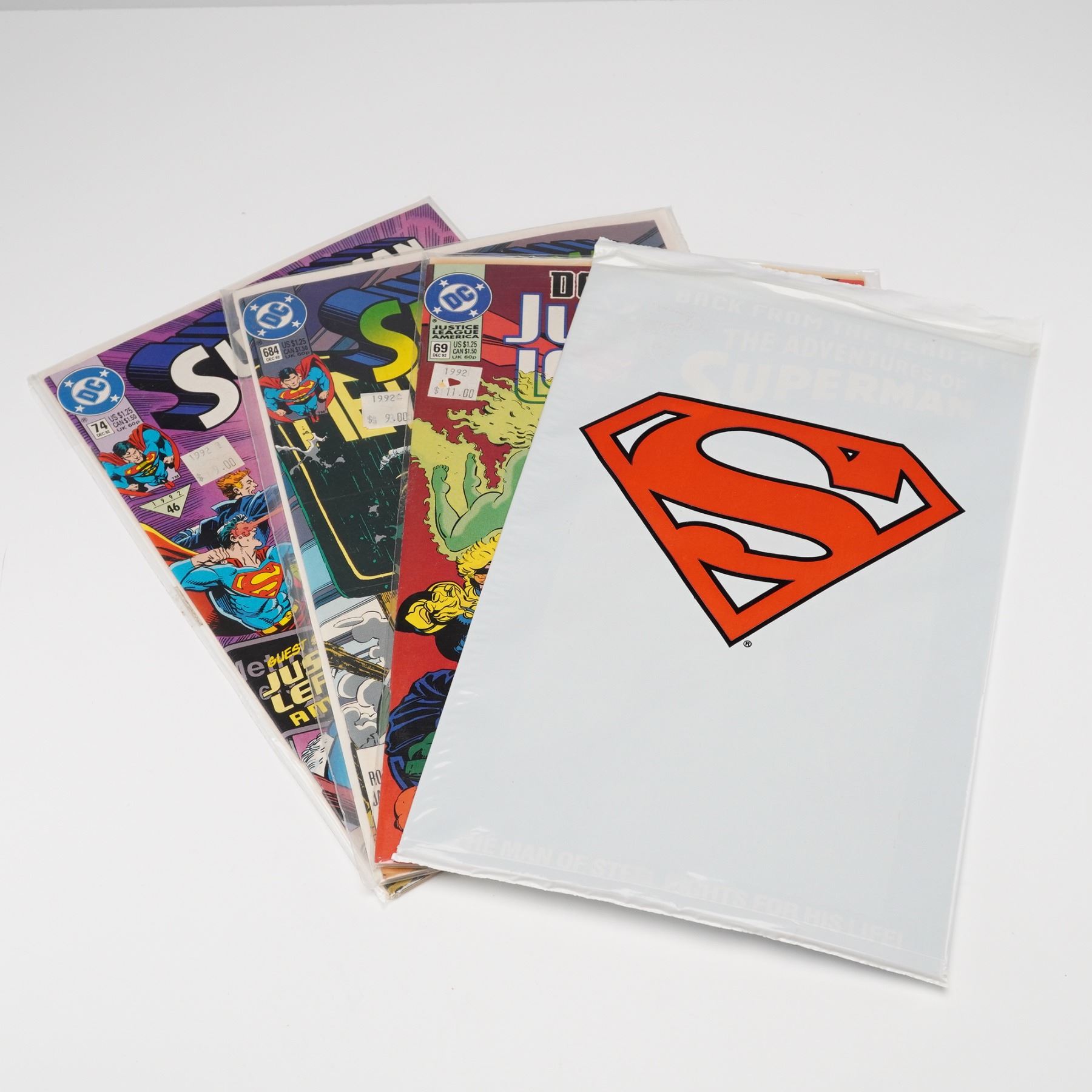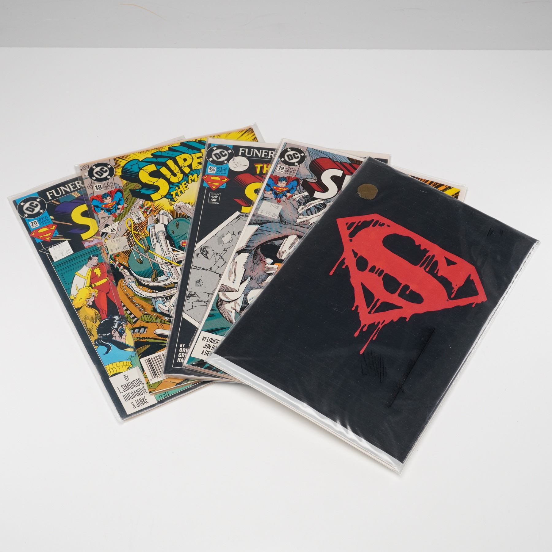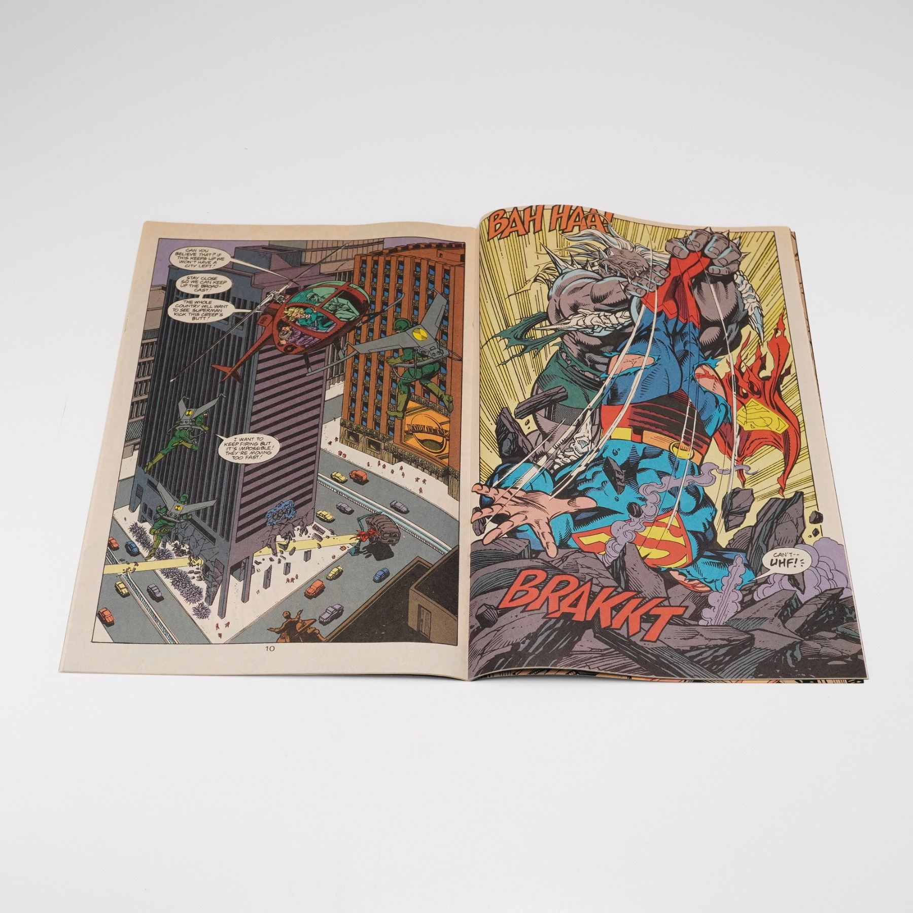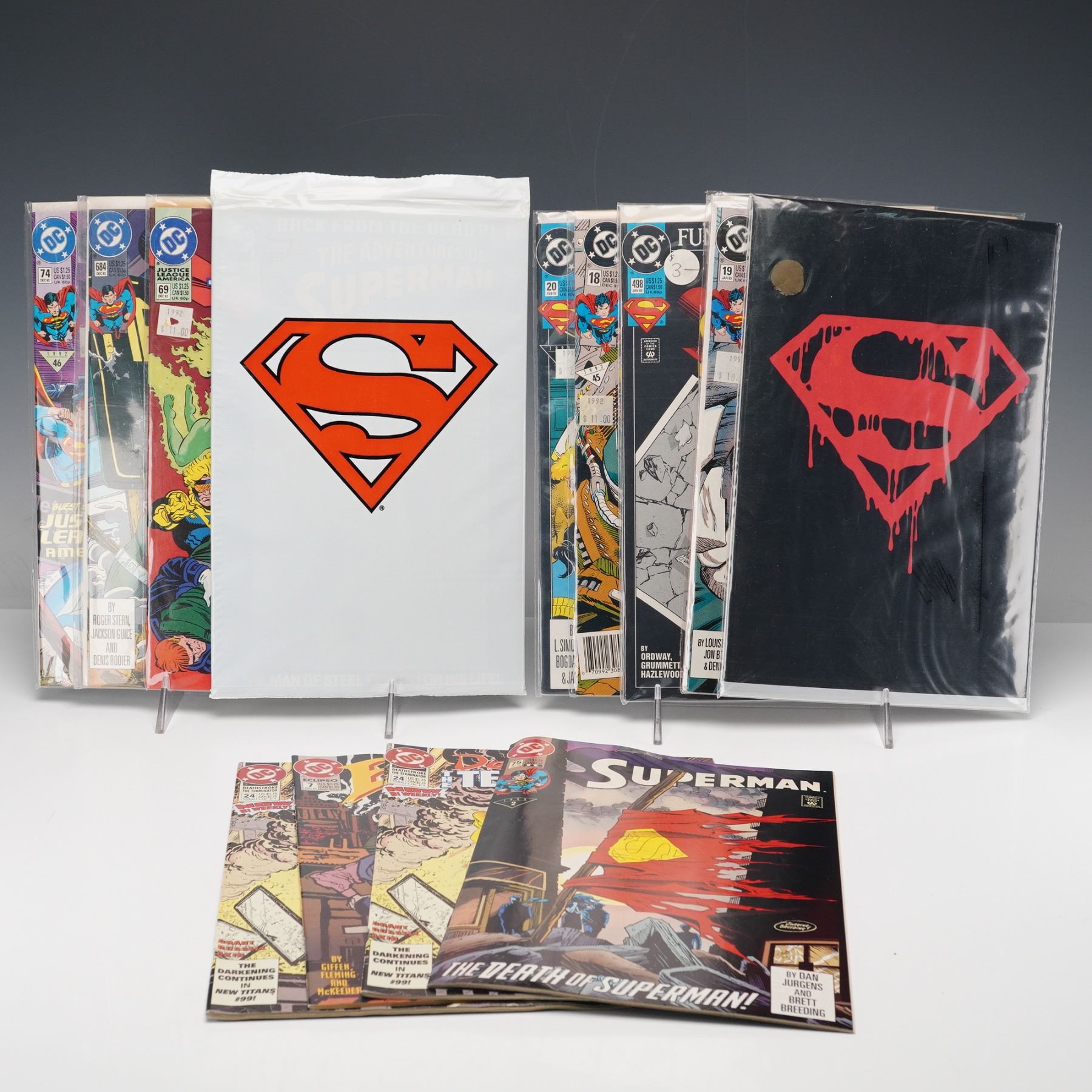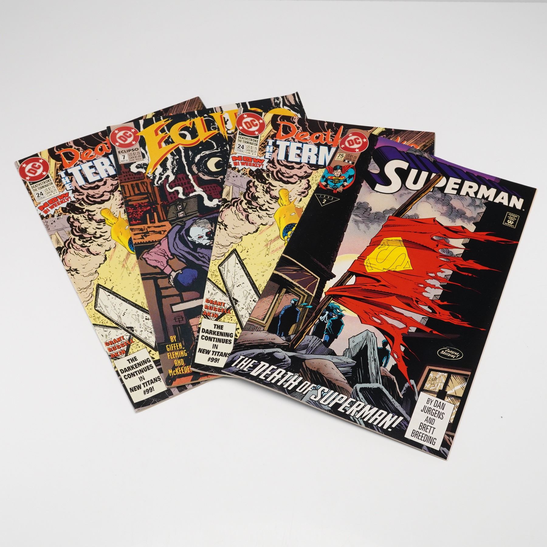 Chronicling the epic "Death and Return of Superman" saga from the early 1990s. This lot includes key chapters from the monumental story line featuring Superman's battle against Doomsday, his tragic demise, and the aftermath explored in "Funeral for a Friend." Among the highlights are "The Death of Superman" issue with its iconic cover depicting the tattered red cape, the black polybag edition with the bleeding 'S' emblem, and the white polybag return issue symbolizing hope and rebirth. Also included are crossover titles featuring Justice League appearances and tie-ins from related story arcs such as "Eclipso: The Darkness Within." Together, these issues capture one of the most significant events in modern comic history and a defining era for the Man of Steel. This set of issues is graded at (VG) or Very Good.