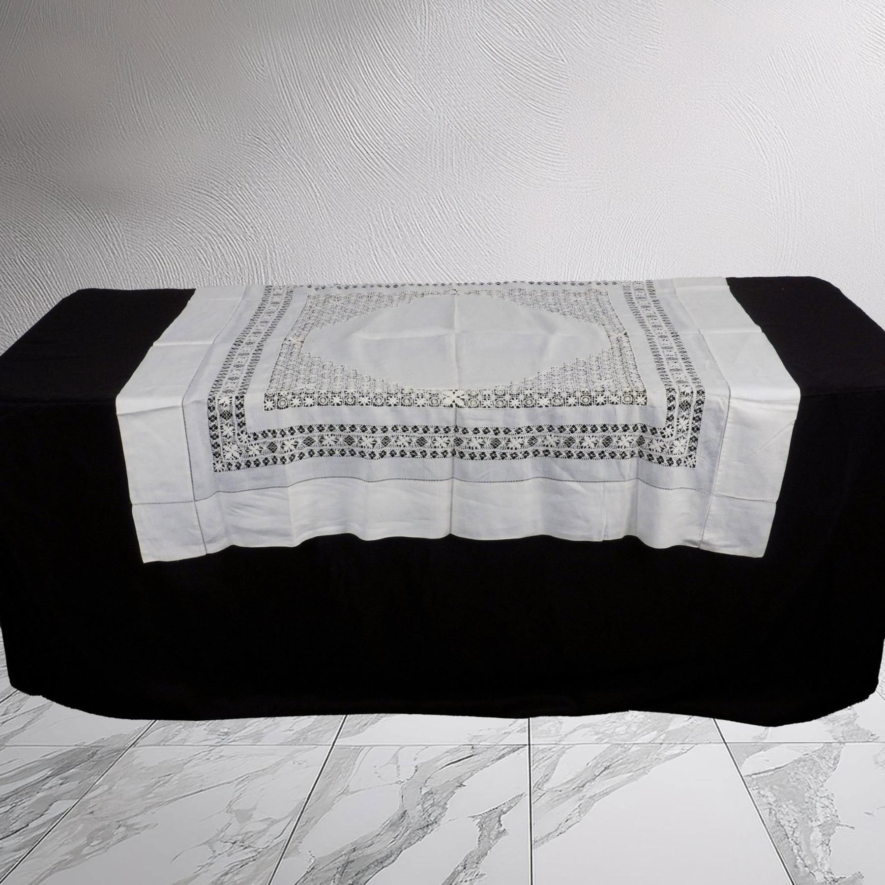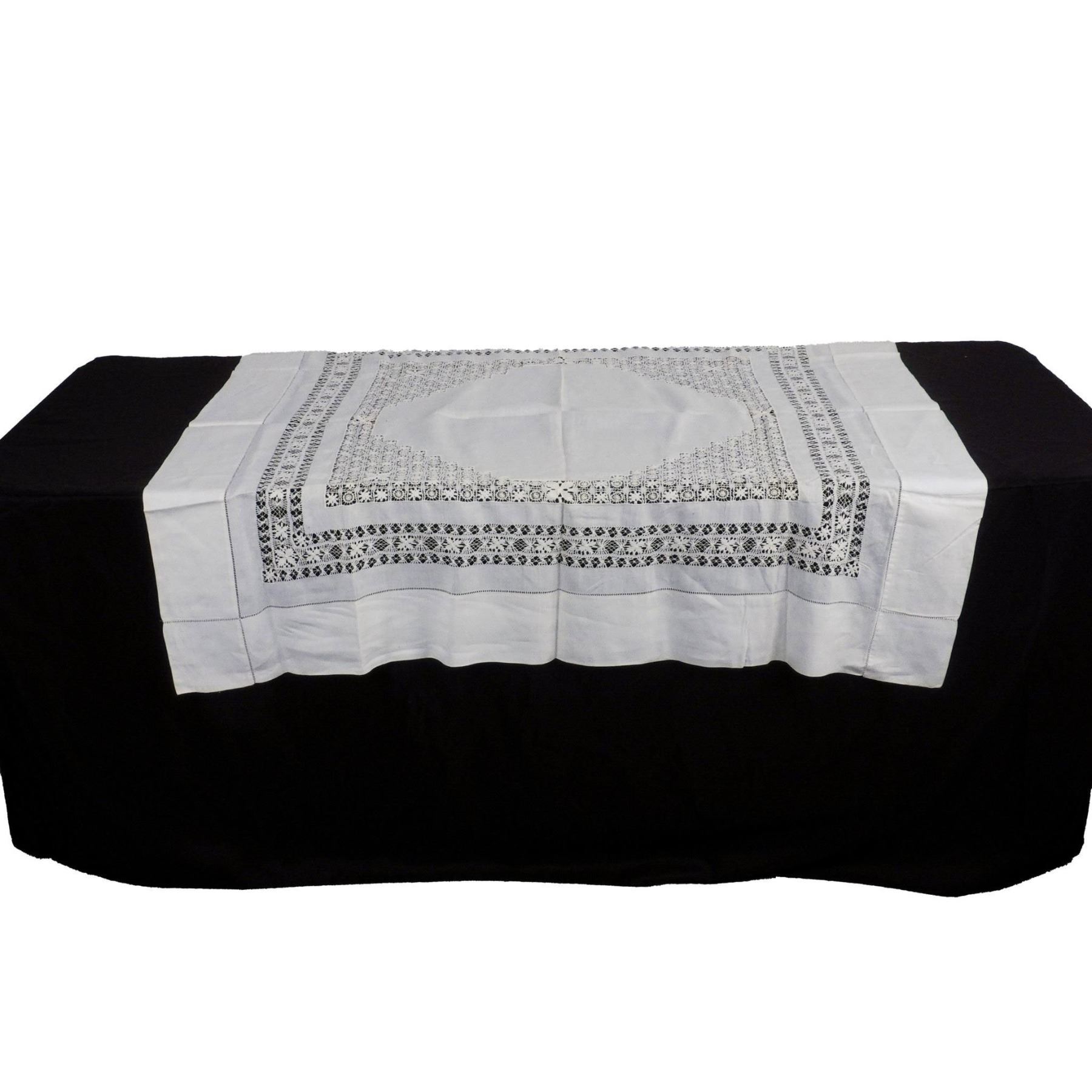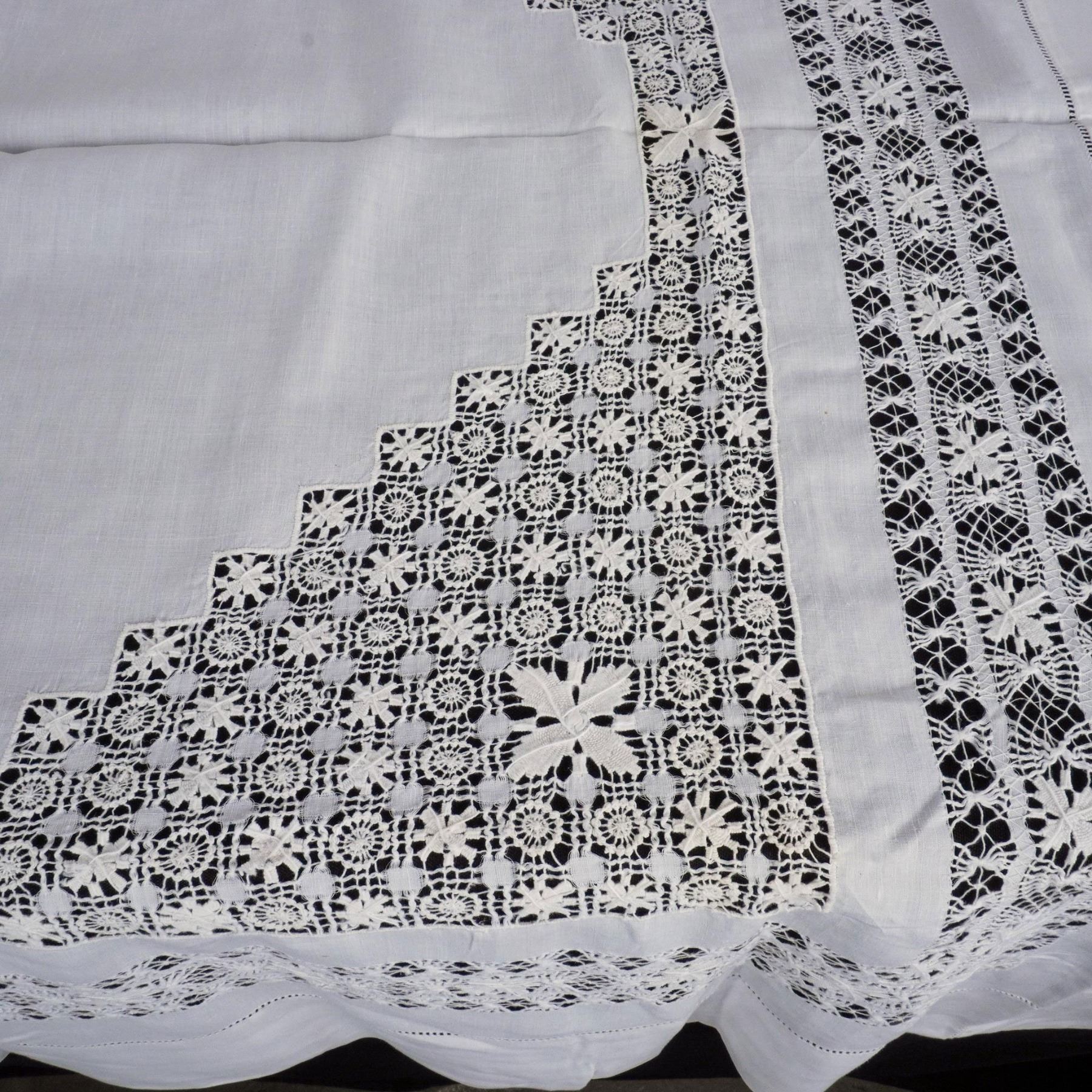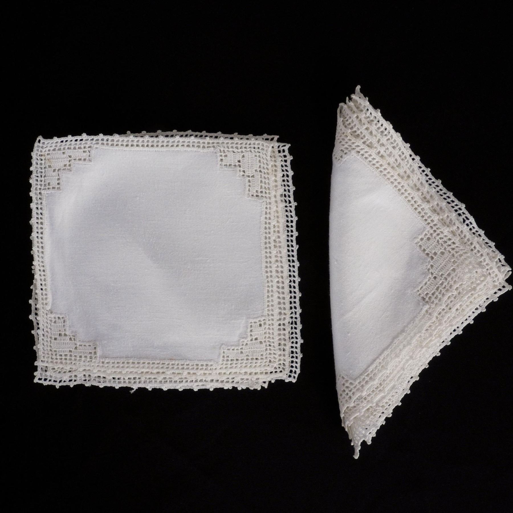Lot includes white cotton tablecloth (52"L x 52"W) with crocheted center and border design and 13 square linen coasters with crocheted edge (7"L x 7"W). Issued: 20th century