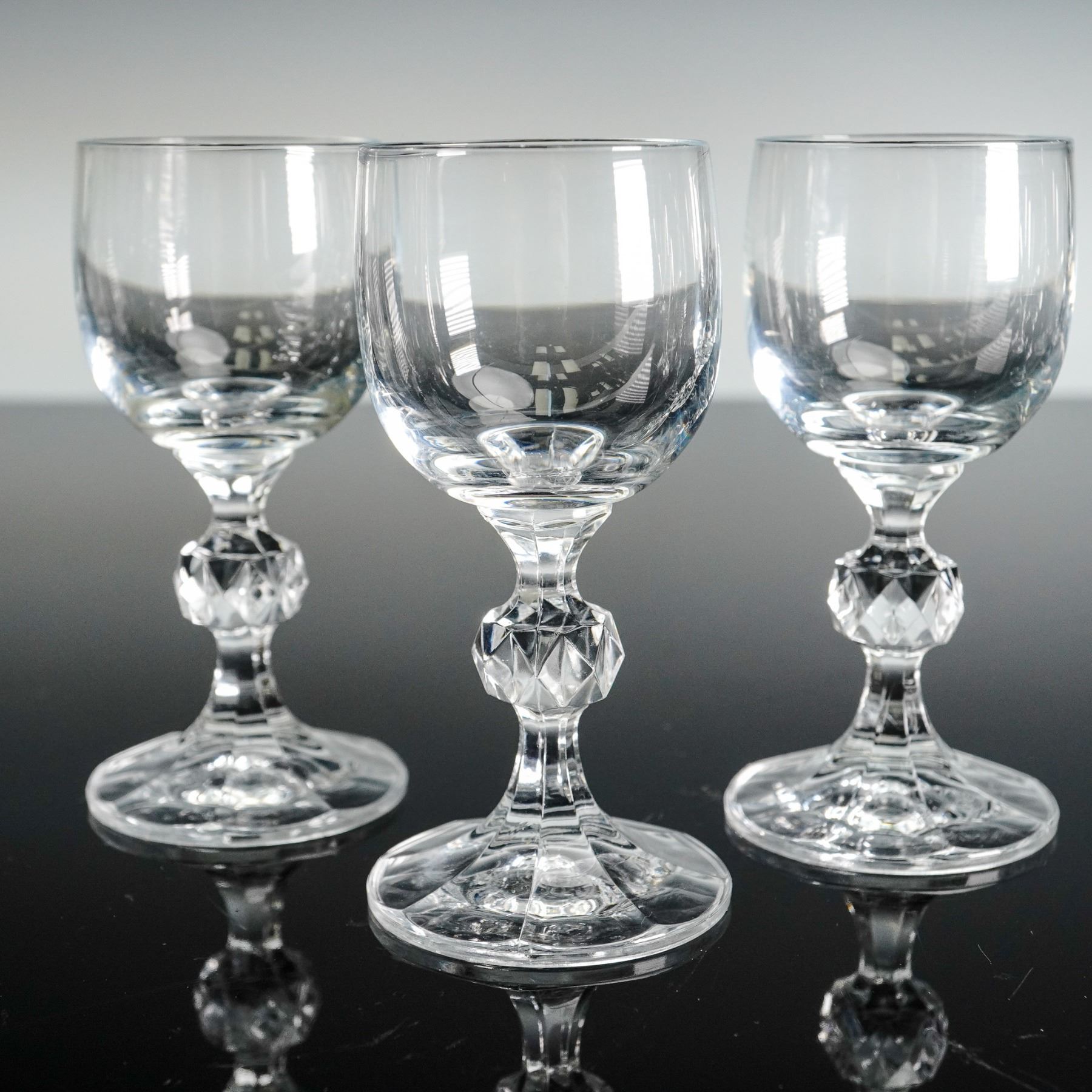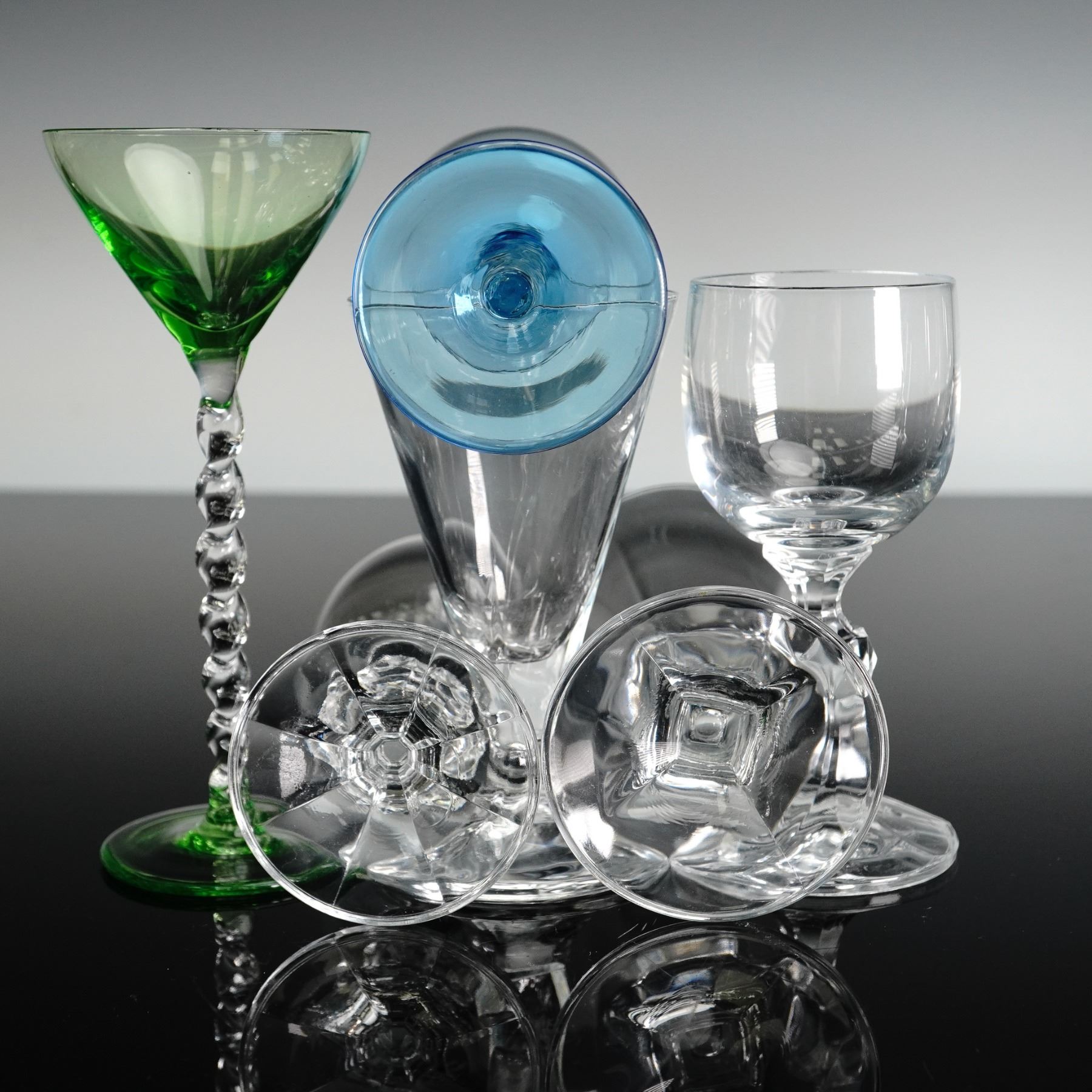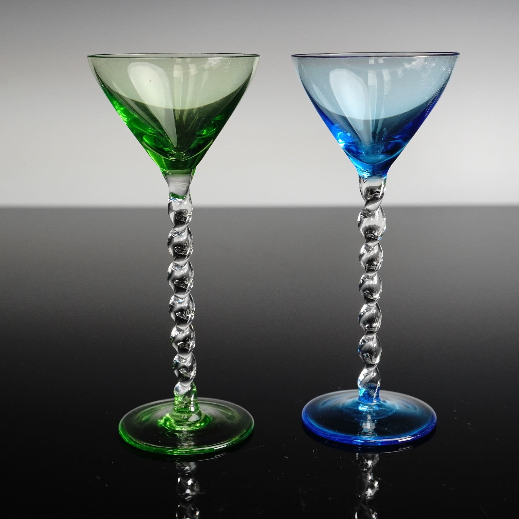 This elegant 14-piece vintage stemware set includes a stunning mix of clear and colored glasses featuring various stem designs. Among the collection are three clear goblets with faceted knop stems, three flared bowl stems with wide circular bases, and a selection of uniquely twisted stems, including two striking colored glasses-one in green and one in blue-with spiral stems and matching footed bases. The set showcases a refined array of mid-century to late 20th-century European-inspired glassmaking techniques, perfect for collectors or formal entertaining. A beautiful blend of clarity, craftsmanship, and charm.
