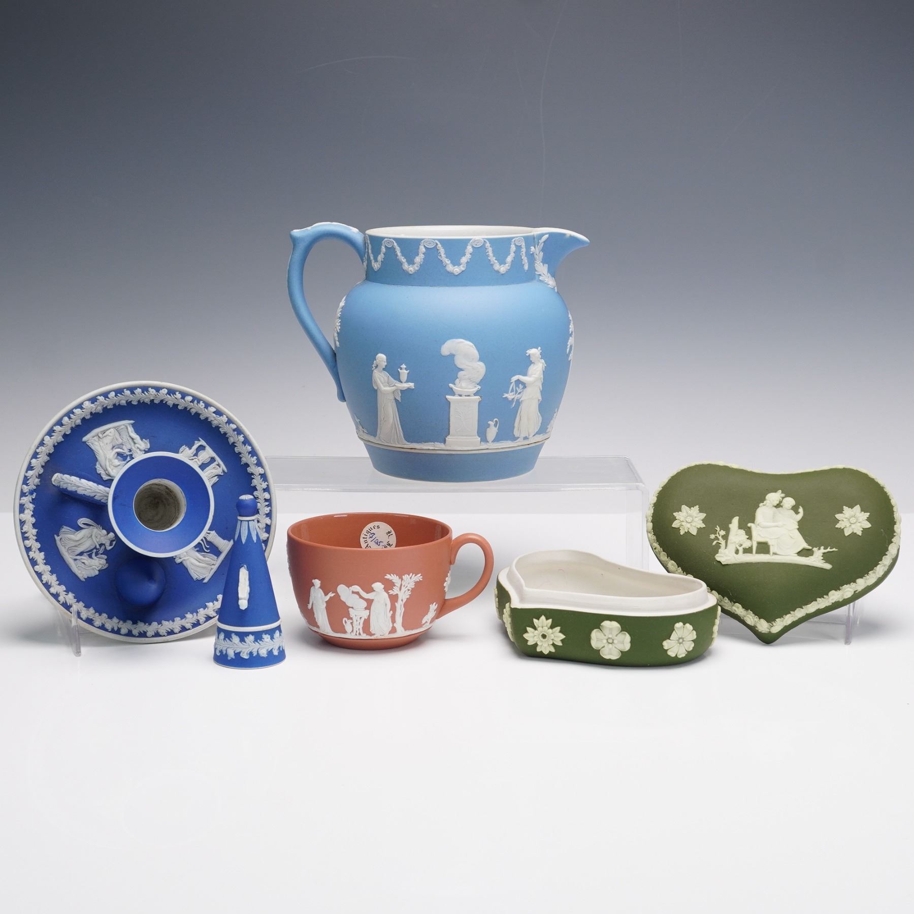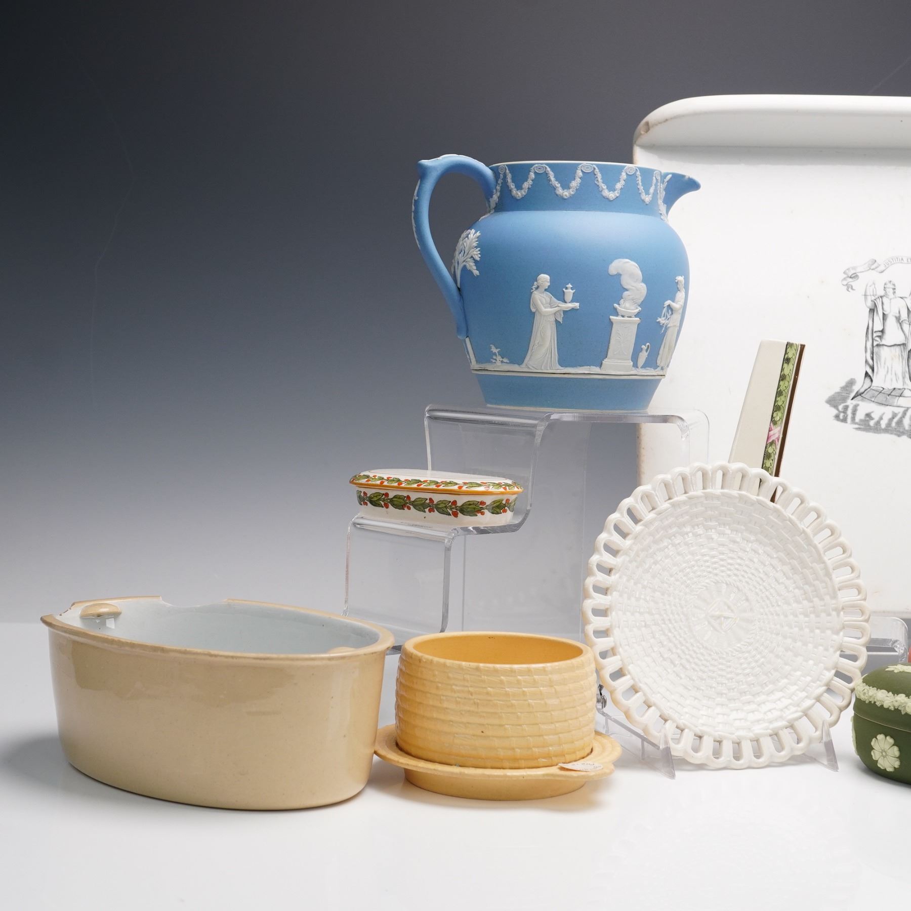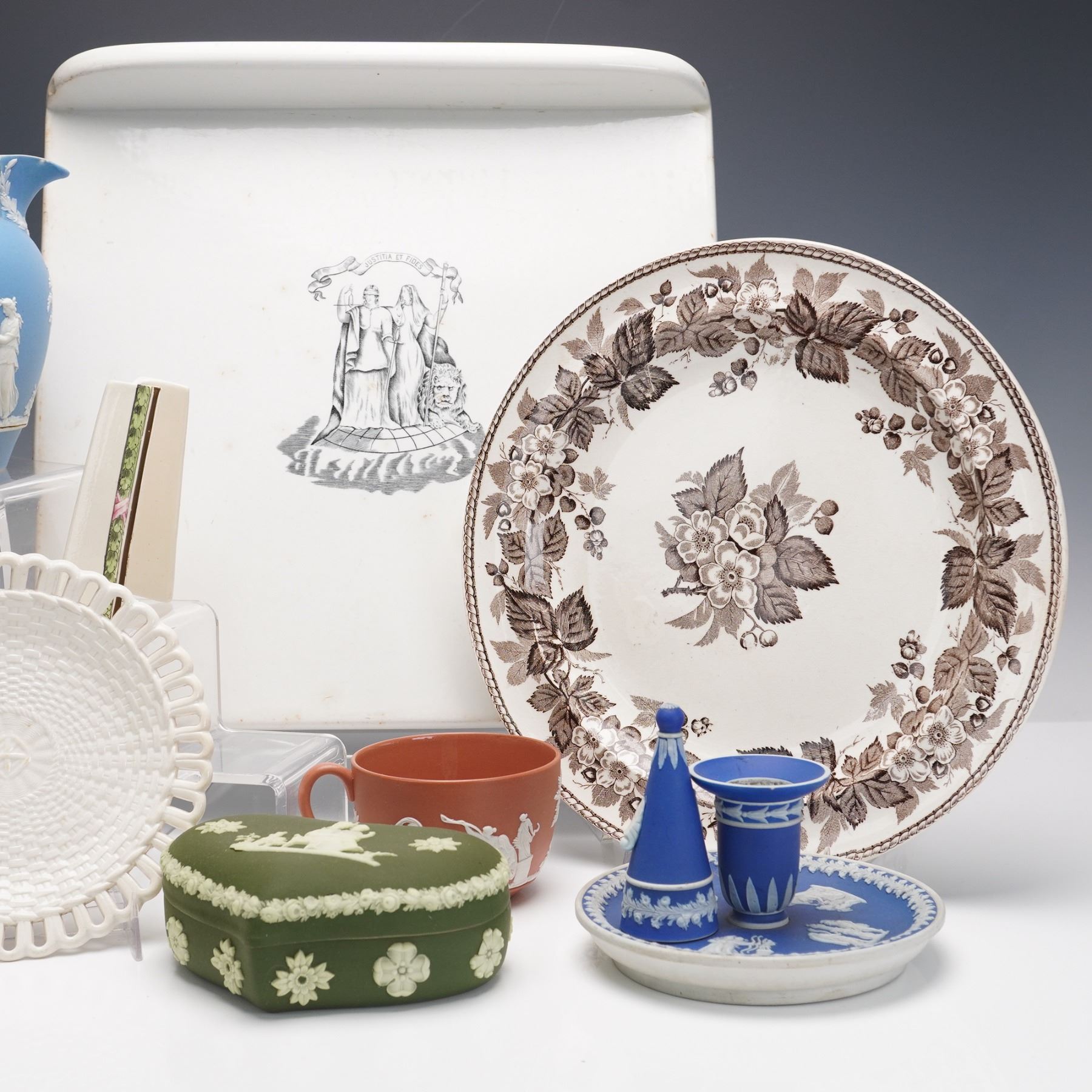 An assorted group of fourteen ceramic articles including a Jasperware chamber candlestick. a Jasperware heart shaped box with lid, a Jasperware cup, a Jasperware pitcher, a ceramic reticulated plate, an ironstone advertising scale plate, a dinner plate in the Home Sweet Home pattern, a small lidded box in oval shape decorated with leaves and berries and a painted yellow band along rim of dish and on lid. Also included are a mid 19th century Victorian dish in a cream color, a coffee cup with attached saucer, and a ceramic decorative object. Wedgwood backstamp.