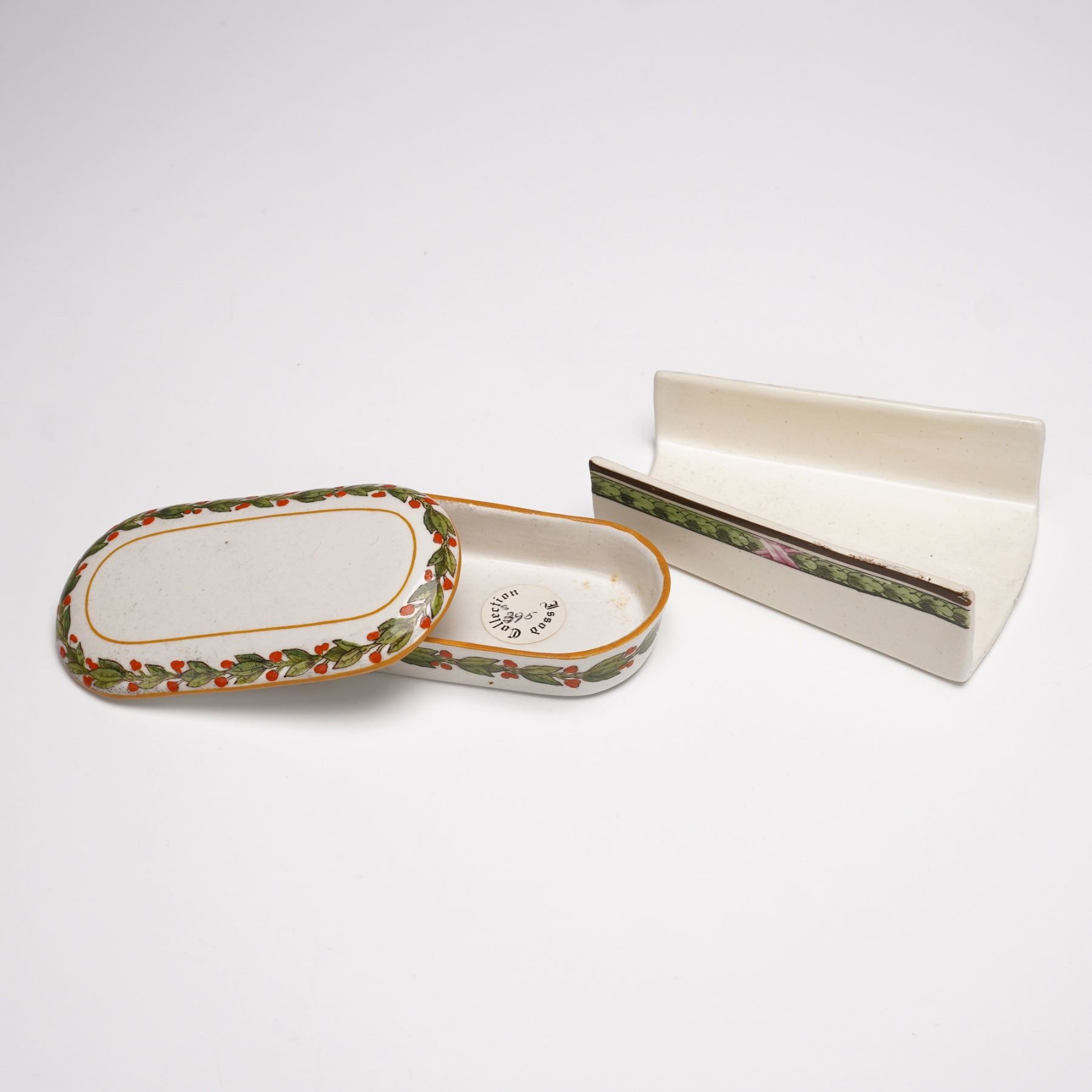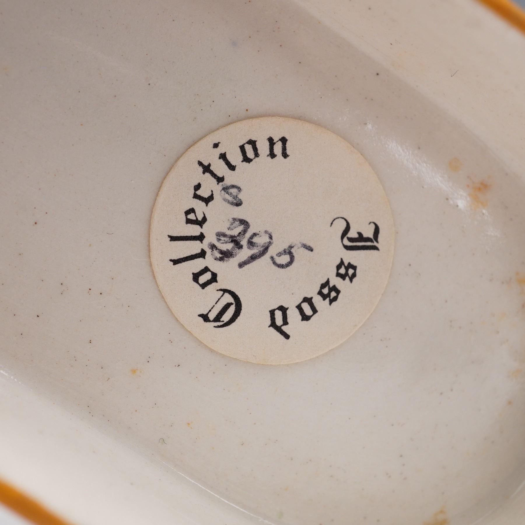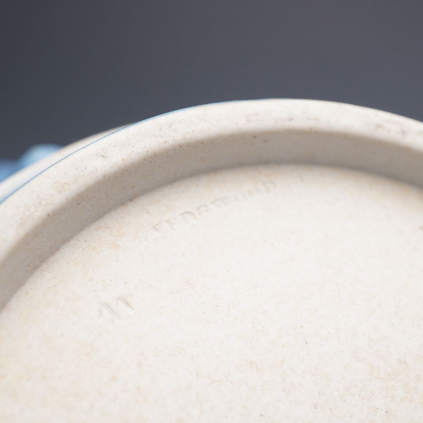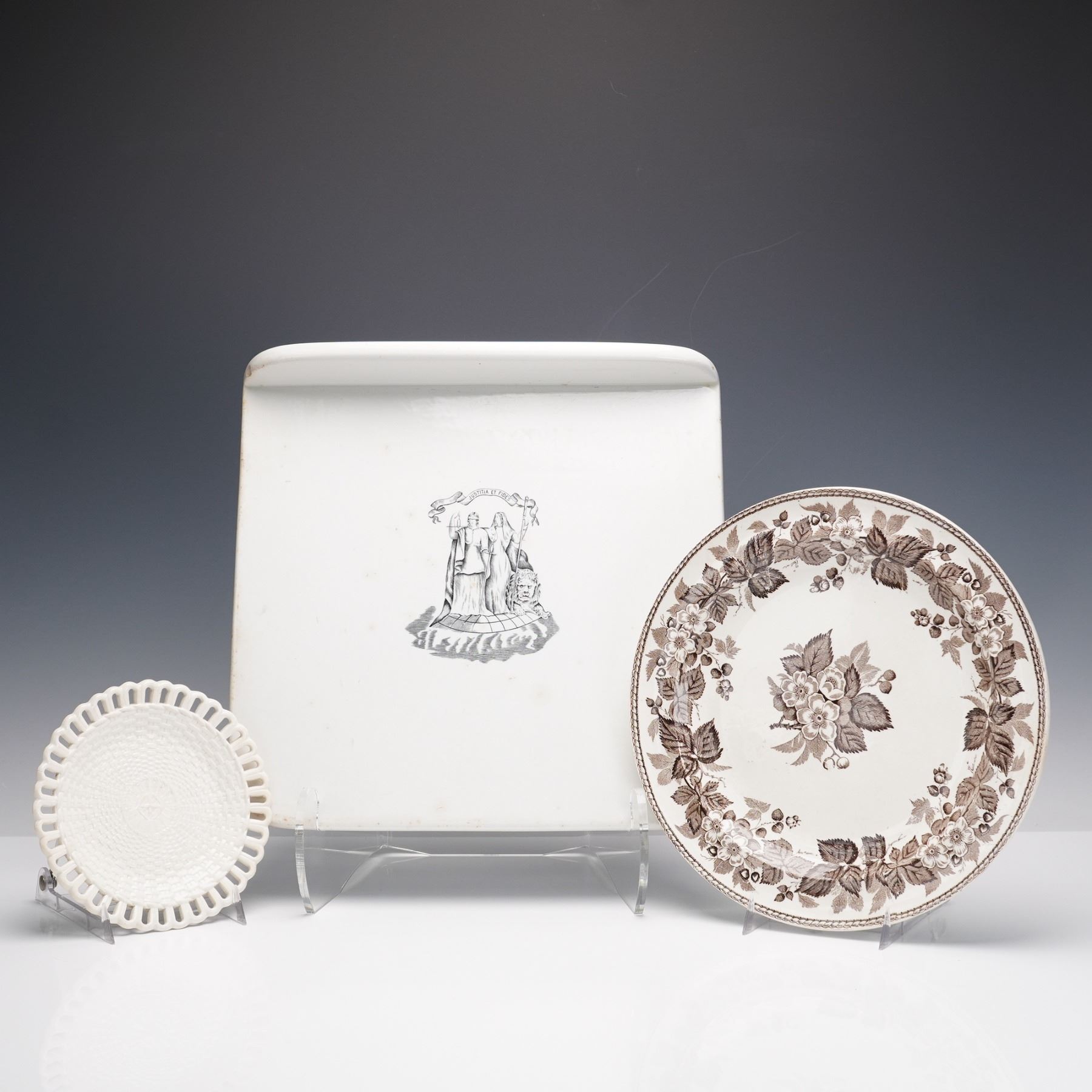 An assorted group of fourteen ceramic articles including a Jasperware chamber candlestick. a Jasperware heart shaped box with lid, a Jasperware cup, a Jasperware pitcher, a ceramic reticulated plate, an ironstone advertising scale plate, a dinner plate in the Home Sweet Home pattern, a small lidded box in oval shape decorated with leaves and berries and a painted yellow band along rim of dish and on lid. Also included are a mid 19th century Victorian dish in a cream color, a coffee cup with attached saucer, and a ceramic decorative object. Wedgwood backstamp.