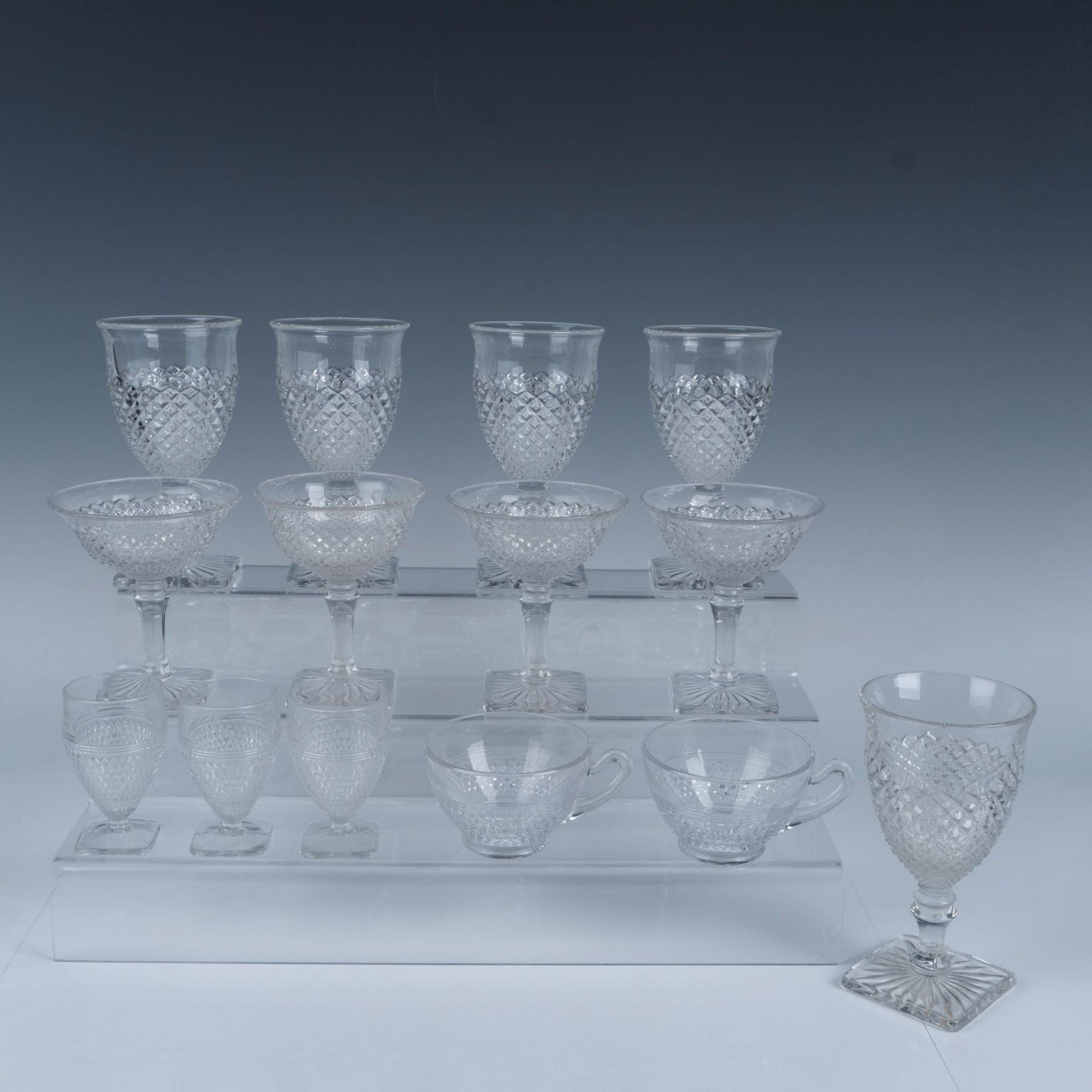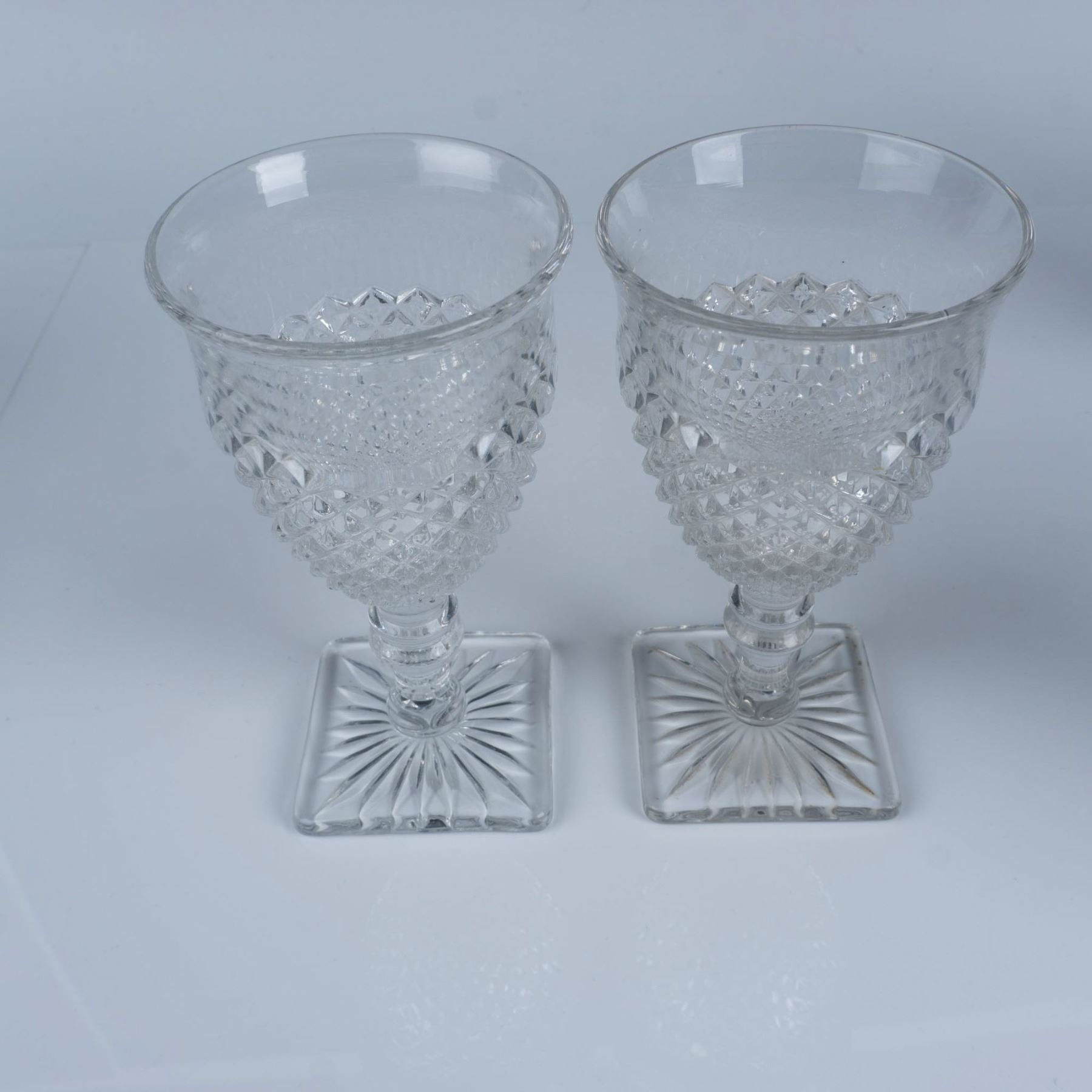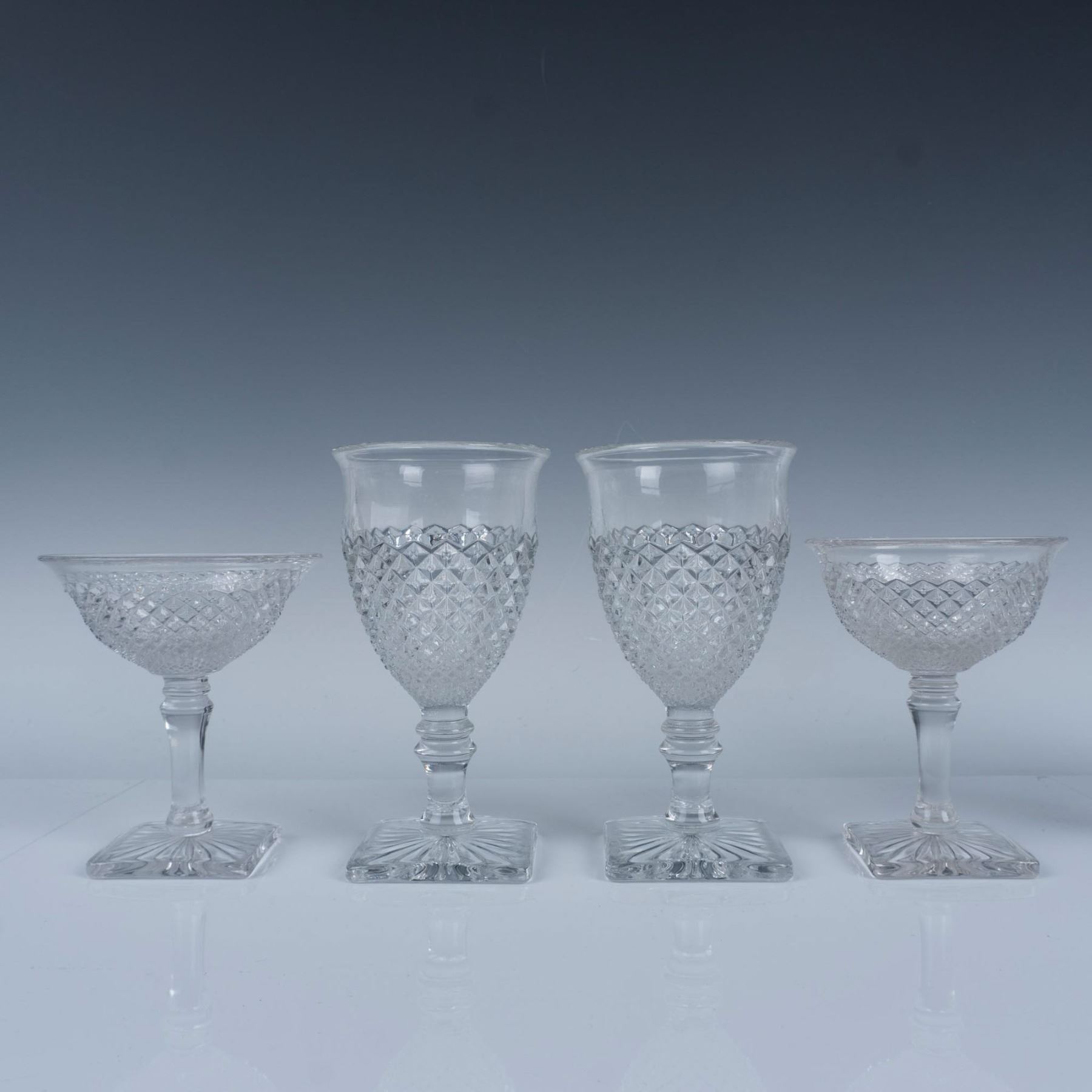 Gorgeous collection of glassware with a hobnail and diamond cut design that includes five water goblets, four sherbet glasses, two teacups, and three cordial glasses. Largest item measures 6.25"H x 3.25" dia.