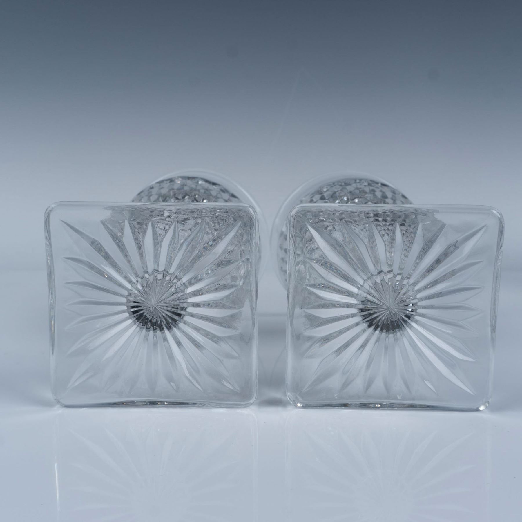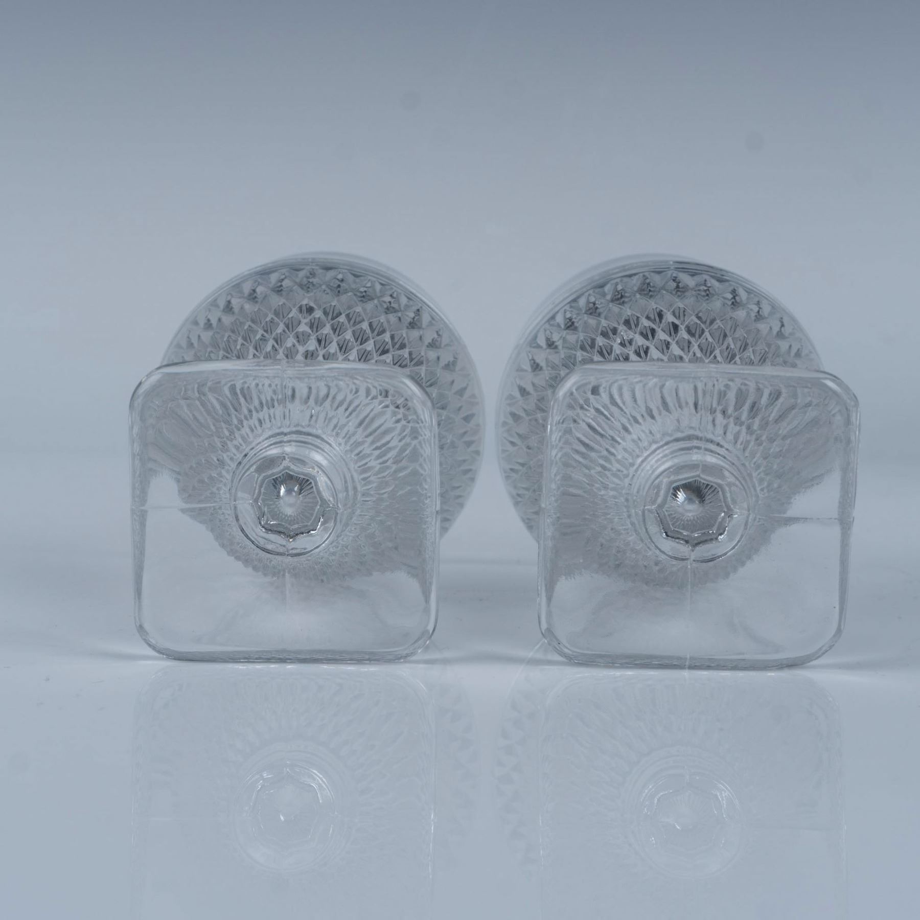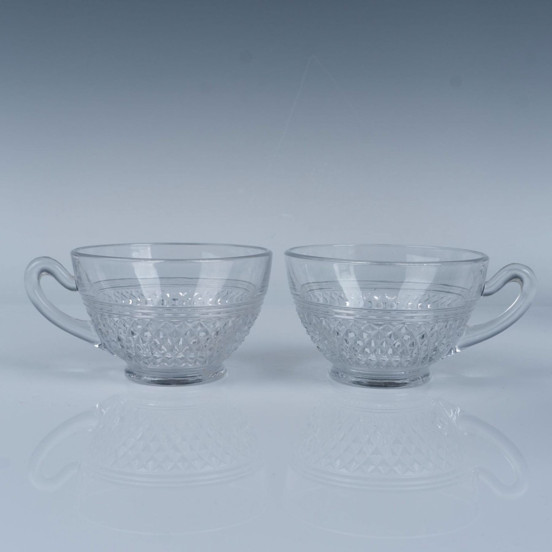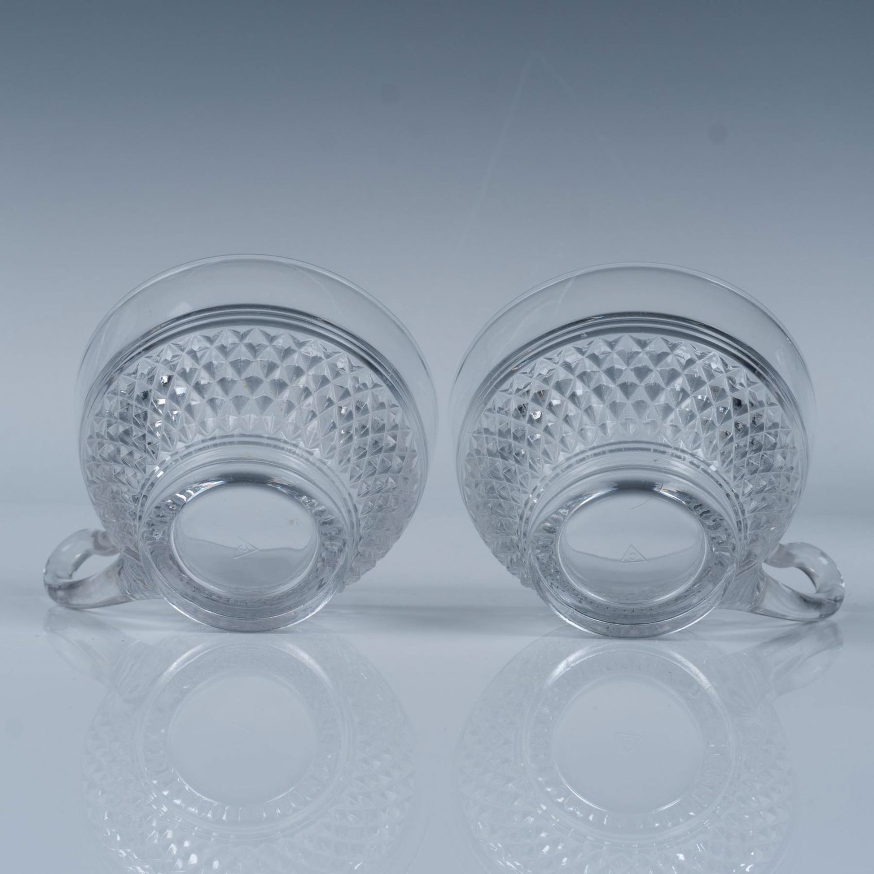 Gorgeous collection of glassware with a hobnail and diamond cut design that includes five water goblets, four sherbet glasses, two teacups, and three cordial glasses. Largest item measures 6.25"H x 3.25" dia.
