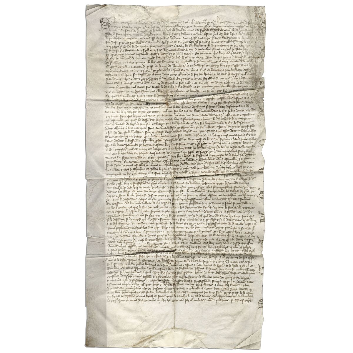 Beautiful 14th century medieval French manuscript on vellum, handwritten in elegant calligraphy. Exceptionally large document, measuring 12'' x 23.5'', is dated 1395 on verso and is likely a legal contract. Overall in very good to near fine condition, considering age. One vertical and three horizontal folds, very light toning and wear. Ideal for display.