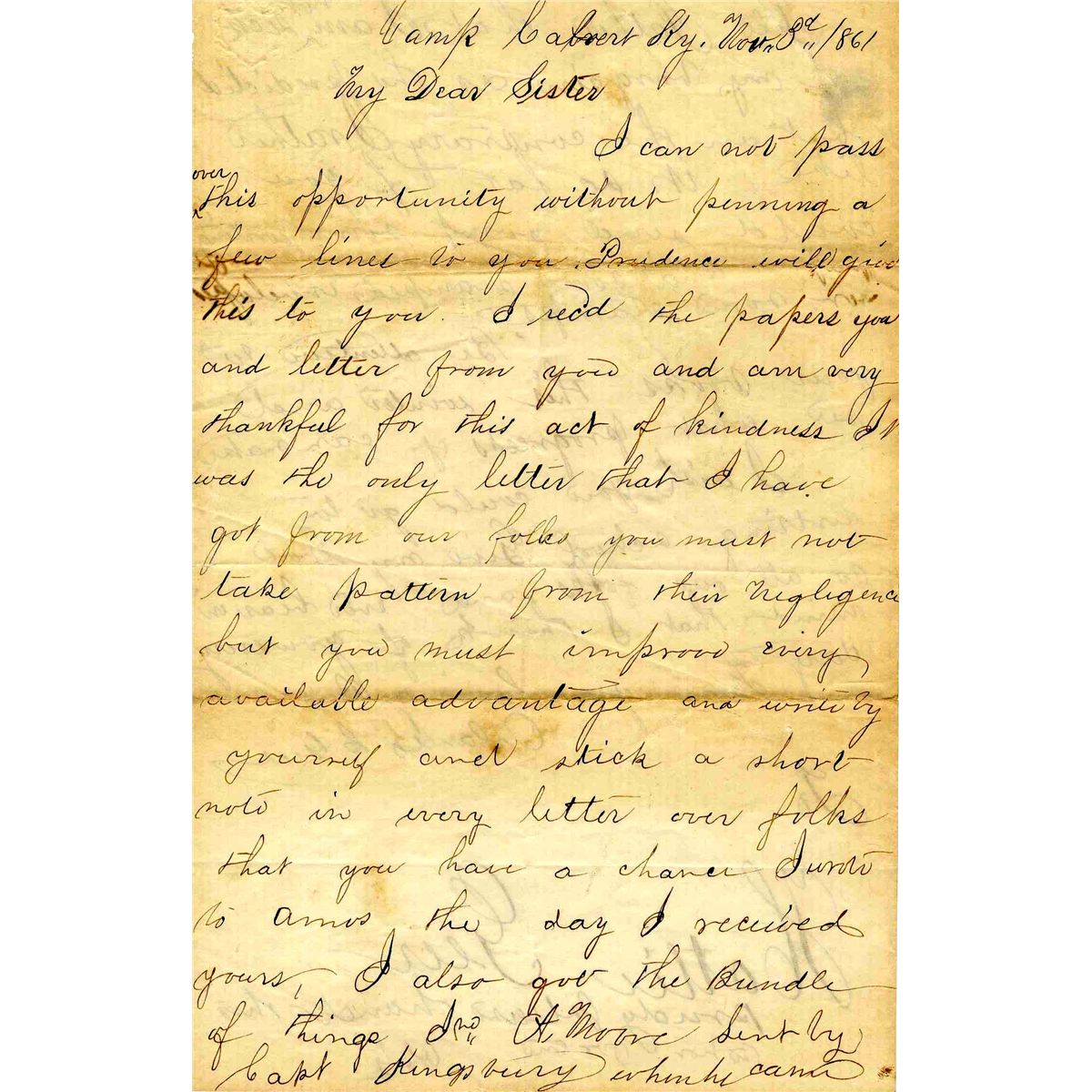 Letter from Corporal Orlando C. Geer of the 14th Ohio Infantry, Company A, to his sister. Written in ink and datelined ''Camp Calbert KY Nov 3rd, 1861,'' letter reads in part: ''…I rec'd the papers and letter from you and am very thankful for this act of kindness. It was the only letter that I have got from our folks. You must not take pattern from their neglegence but you must improve every available advantage and write by yourself and stick a short note in every letter…that you have a chance. I wrote to Amos the day I received yours. I also got the Bundle of things Jno. A. Moore sent by Capt. Kingsbury which came. Tell Father that I am not sick of my bargain as he predicted but on the contrary I rather like it so far. If you could send some writing paper and some stamped envelopes or some stamps. Be attentive to your books this winter and see what progress you can make. I wish you could go to writing school. Give my love to all our folks and…bear in mind that I think of you every day. From your loving Brother…'' Geer mustered into Company A on 19 August 1861 and mustered out on 11 July 1865 as a Sergeant. The 14th Ohio saw action at Corinth, Perryville, Hoover's Gap, Chickamauga, Chattanooga and throughout the Atlanta Campaign. 2pp. letter measures 5'' x 8''. Near fine condition.