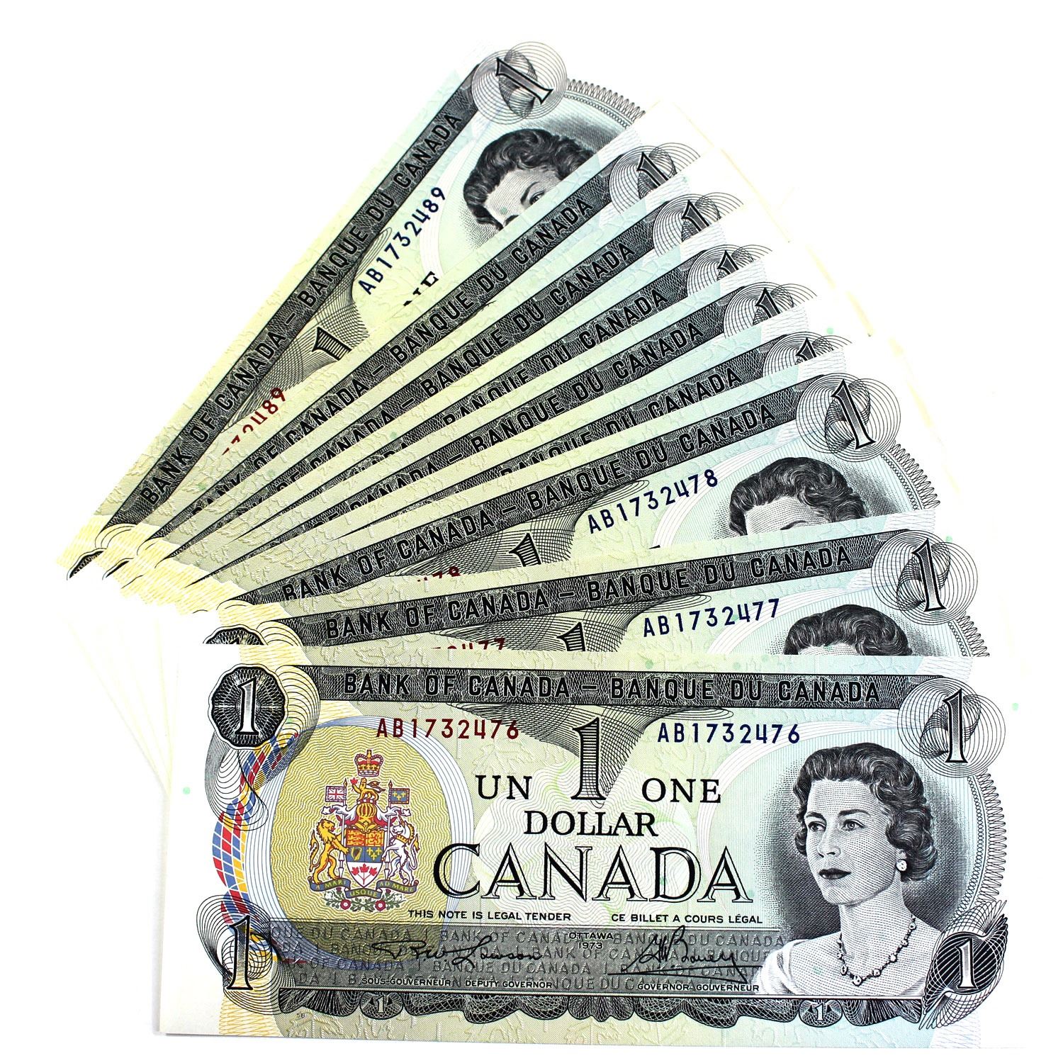14x BC-46a 1973 Bank of Canada $1 Notes with Consecutive Serial Numbers AB1732476-489, UNC. 14pcs