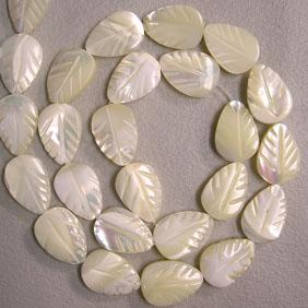 CARVED MOTHER OF PEARL LEAVES STRAND. EACH PEARL MEASURES 14x10 MM APPROX. LENGTH: 16 INCHES