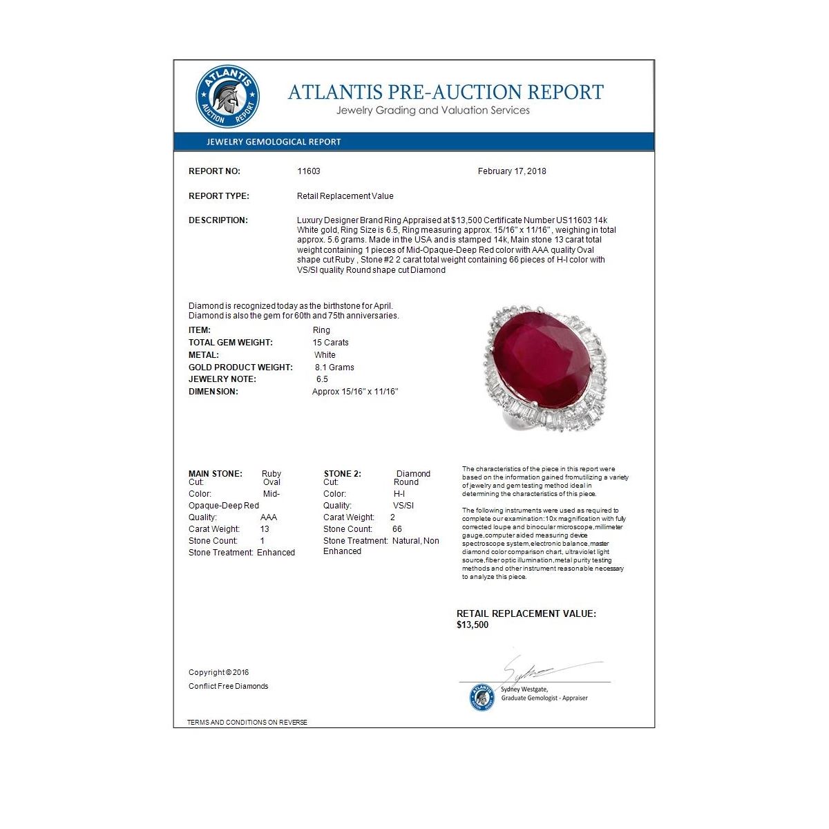 REF-175Y3K -11603 ---- 15.0 CTW Ruby & Diamond Ring 14K White Gold ---- Luxury Designer Brand Ring Appraised at $13,500 Certificate Number US11603 14k White gold, Ring Size is 6.5, Ring measuring approx. 15/16" x 11/16" , weighing in total approx. 5.6 grams. Made in the USA and is stamped 14k, Main stone 13 carat total weight containing 1 pieces of Mid-Opaque-Deep Red color with AAA quality Oval shape cut Ruby , Stone #2 2 carat total weight containing 66 pieces of H-I color with VS/SI quality Round shape cut Diamond