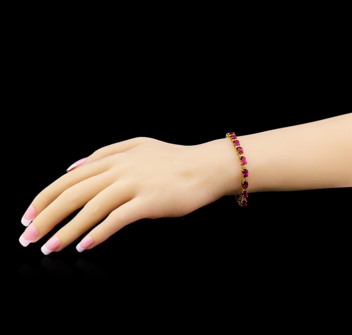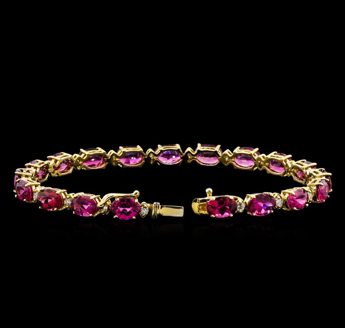 One 14KT yellow gold 15.00ctw tourmaline and diamond bracelet. Metal: 14KT solid yellow gold. Face Measurements: 5 x 180mm. Size: 7.5. Finish: Bright polish. Total Item Weight: 10.5 grams. Markings: Stamped 14K. Country Made: USA. Containing: 19 oval Tourmalines with a total weight of 15.00ct. Measuring: 5 x 7mm. Color: Pink. Treatment: None. Setting: Prong. Saturation: Moderately strong. Tone: Dark. Clarity: Type 2. Cut: Very good. The tourmalines are complemented by 19 round Diamonds with a total weight of 0.80ct. Measuring: 1.8mm. Treatment: None. Setting: Prong. Color Grade: H - I. Clarity: SI1 - SI2. Cut: Very good. Excellent workmanship. Gemstones graded in the setting. BHGL Appraised at $10,500.00.