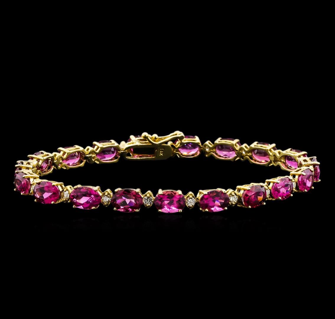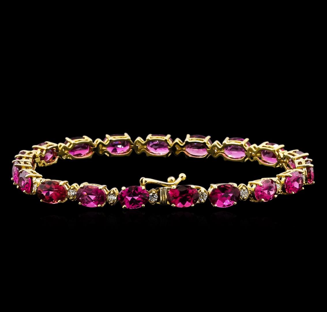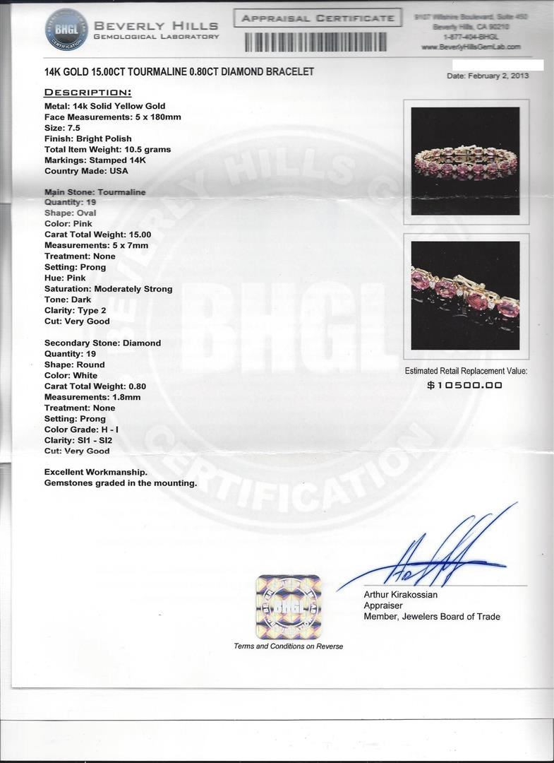 One 14KT yellow gold 15.00ctw tourmaline and diamond bracelet. Metal: 14KT solid yellow gold. Face Measurements: 5 x 180mm. Size: 7.5. Finish: Bright polish. Total Item Weight: 10.5 grams. Markings: Stamped 14K. Country Made: USA. Containing: 19 oval Tourmalines with a total weight of 15.00ct. Measuring: 5 x 7mm. Color: Pink. Treatment: None. Setting: Prong. Saturation: Moderately strong. Tone: Dark. Clarity: Type 2. Cut: Very good. The tourmalines are complemented by 19 round Diamonds with a total weight of 0.80ct. Measuring: 1.8mm. Treatment: None. Setting: Prong. Color Grade: H - I. Clarity: SI1 - SI2. Cut: Very good. Excellent workmanship. Gemstones graded in the setting. BHGL Appraised at $10,500.00.