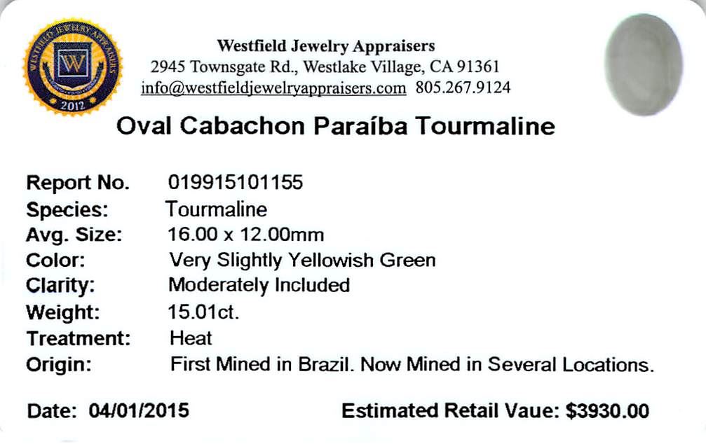 One oval cabochon cut natural Paraiba tourmaline exact weight 15.01ct., clarity is moderately included, cut is good. Westfield Appraised at $3,930.00.