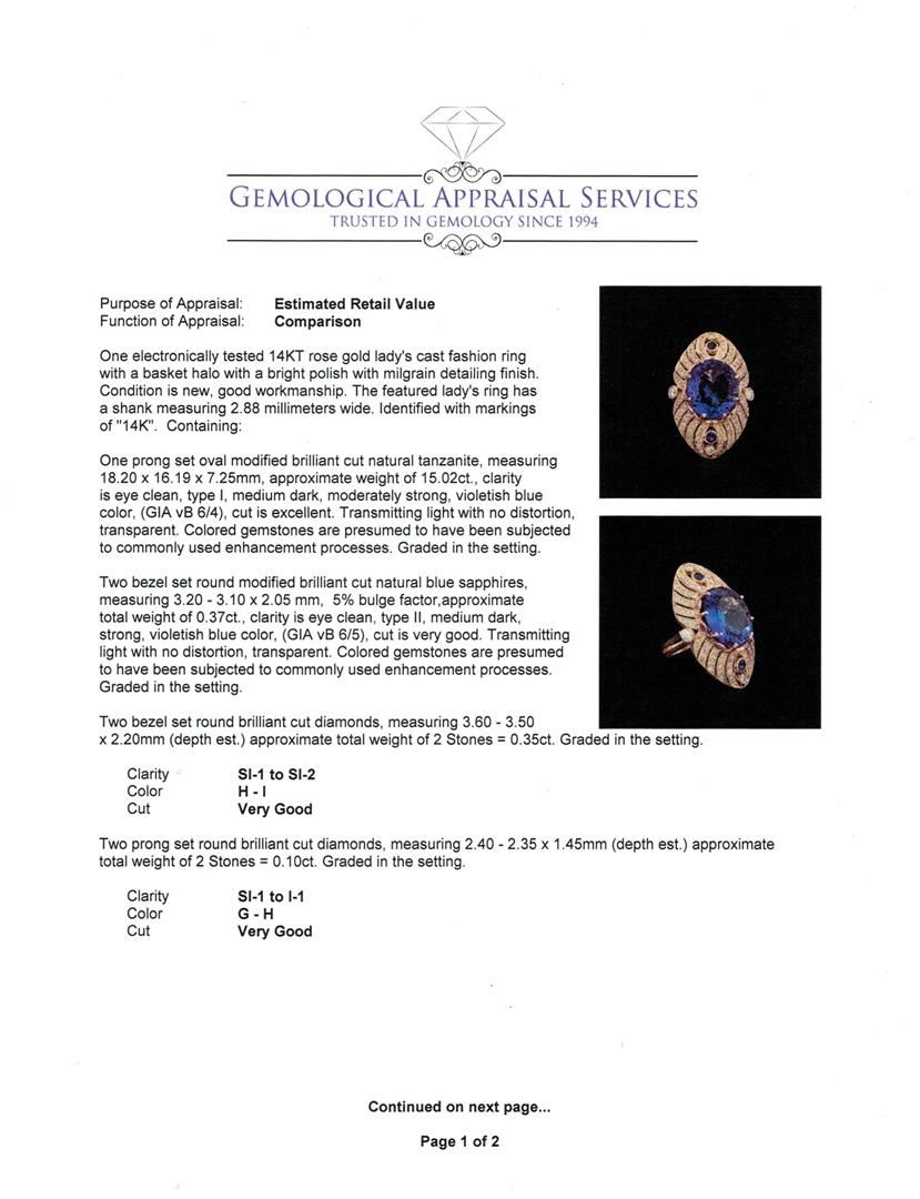 One electronically tested 14KT rose gold lady's cast fashion ring with a basket halo with a bright polish with milgrain detailing finish. The featured lady's ring has a shank measuring 2.88 millimeters wide. Identified with markings of "14K". Condition is new, good workmanship. Containing: One prong set oval modified brilliant cut natural tanzanite, measuring 18.20 x 16.19 x 7.25mm, approximate weight of 15.02ct., clarity is eye clean, type I, medium dark, moderately strong, violetish blue color, (GIA vB 6/4), cut is excellent. Transmitting light with no distortion, transparent. Colored gemstones are presumed to have been subjected to commonly used enhancement processes. Graded in the setting. Two bezel set round modified brilliant cut natural blue sapphires, measuring 3.20 - 3.10 x 2.05 mm, 5%. bulge factor, approximate total weight of 0.37ct., clarity is eye clean, type II, medium dark, strong, violetish blue color, (GIA vB 6/5), cut is very good. Transmitting light with no distortion, transparent. Colored gemstones are presumed to have been subjected to commonly used enhancement processes. Graded in the setting. Two bezel set round brilliant cut diamonds, measuring 3.60 - 3.50 x 2.20mm (depth est.) approximate total weight of 2 Stones = 0.35ct. Graded in the setting. Clarity: SI-1 to SI-2. Color: H - I. Cut Very Good Two prong set round brilliant cut diamonds, measuring 2.40 - 2.35 x 1.45mm (depth est.) approximate total weight of 2 Stones = 0.10ct. Graded in the setting. Clarity: SI-1 to I-1. Color: G - Very Good Eighty prong set round brilliant cut diamonds, measuring 1.55 - 1.45 x 0.93mm (depth est.) approximate total weight of 80 Stones = 1.02ct. Graded in the setting. Clarity: SI-1 to I-1. Color: G - I. Cut Good Eight prong set round brilliant cut diamonds, measuring 1.30 - 1.20 x 0.78mm (depth est.) approximate total weight of 8 Stones = 0.06ct. Graded in the setting. Clarity: SI-1 to I-1. Color: H - I. Cut Good. Total Weight of Colored Stones 15.39ct. Total Weight of Diamonds 1.53ct. Total Weight of Ring 17.40gm. GAS Appraised at $34,415.00.