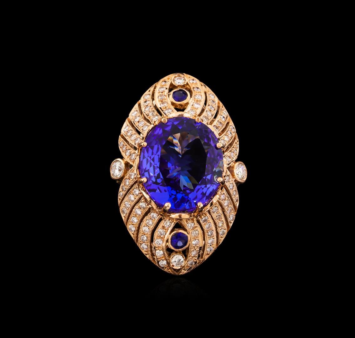 One electronically tested 14KT rose gold lady's cast fashion ring with a basket halo with a bright polish with milgrain detailing finish. The featured lady's ring has a shank measuring 2.88 millimeters wide. Identified with markings of "14K". Condition is new, good workmanship. Containing: One prong set oval modified brilliant cut natural tanzanite, measuring 18.20 x 16.19 x 7.25mm, approximate weight of 15.02ct., clarity is eye clean, type I, medium dark, moderately strong, violetish blue color, (GIA vB 6/4), cut is excellent. Transmitting light with no distortion, transparent. Colored gemstones are presumed to have been subjected to commonly used enhancement processes. Graded in the setting. Two bezel set round modified brilliant cut natural blue sapphires, measuring 3.20 - 3.10 x 2.05 mm, 5%. bulge factor, approximate total weight of 0.37ct., clarity is eye clean, type II, medium dark, strong, violetish blue color, (GIA vB 6/5), cut is very good. Transmitting light with no distortion, transparent. Colored gemstones are presumed to have been subjected to commonly used enhancement processes. Graded in the setting. Two bezel set round brilliant cut diamonds, measuring 3.60 - 3.50 x 2.20mm (depth est.) approximate total weight of 2 Stones = 0.35ct. Graded in the setting. Clarity: SI-1 to SI-2. Color: H - I. Cut Very Good Two prong set round brilliant cut diamonds, measuring 2.40 - 2.35 x 1.45mm (depth est.) approximate total weight of 2 Stones = 0.10ct. Graded in the setting. Clarity: SI-1 to I-1. Color: G - Very Good Eighty prong set round brilliant cut diamonds, measuring 1.55 - 1.45 x 0.93mm (depth est.) approximate total weight of 80 Stones = 1.02ct. Graded in the setting. Clarity: SI-1 to I-1. Color: G - I. Cut Good Eight prong set round brilliant cut diamonds, measuring 1.30 - 1.20 x 0.78mm (depth est.) approximate total weight of 8 Stones = 0.06ct. Graded in the setting. Clarity: SI-1 to I-1. Color: H - I. Cut Good. Total Weight of Colored Stones 15.39ct. Total Weight of Diamonds 1.53ct. Total Weight of Ring 17.40gm. GAS Appraised at $34,415.00.