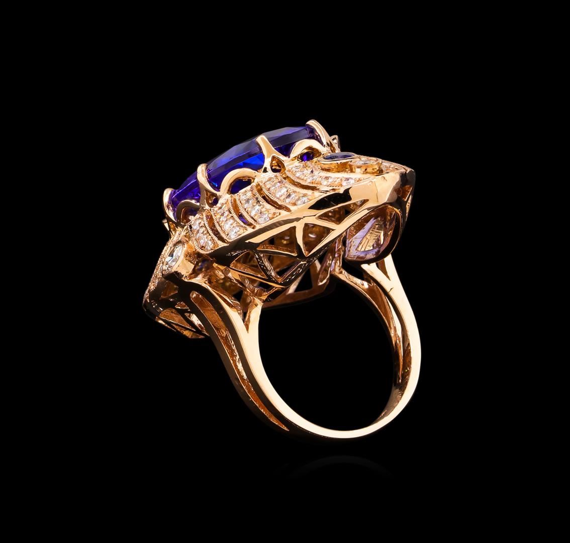 One electronically tested 14KT rose gold lady's cast fashion ring with a basket halo with a bright polish with milgrain detailing finish. The featured lady's ring has a shank measuring 2.88 millimeters wide. Identified with markings of "14K". Condition is new, good workmanship. Containing: One prong set oval modified brilliant cut natural tanzanite, measuring 18.20 x 16.19 x 7.25mm, approximate weight of 15.02ct., clarity is eye clean, type I, medium dark, moderately strong, violetish blue color, (GIA vB 6/4), cut is excellent. Transmitting light with no distortion, transparent. Colored gemstones are presumed to have been subjected to commonly used enhancement processes. Graded in the setting. Two bezel set round modified brilliant cut natural blue sapphires, measuring 3.20 - 3.10 x 2.05 mm, 5%. bulge factor, approximate total weight of 0.37ct., clarity is eye clean, type II, medium dark, strong, violetish blue color, (GIA vB 6/5), cut is very good. Transmitting light with no distortion, transparent. Colored gemstones are presumed to have been subjected to commonly used enhancement processes. Graded in the setting. Two bezel set round brilliant cut diamonds, measuring 3.60 - 3.50 x 2.20mm (depth est.) approximate total weight of 2 Stones = 0.35ct. Graded in the setting. Clarity: SI-1 to SI-2. Color: H - I. Cut Very Good Two prong set round brilliant cut diamonds, measuring 2.40 - 2.35 x 1.45mm (depth est.) approximate total weight of 2 Stones = 0.10ct. Graded in the setting. Clarity: SI-1 to I-1. Color: G - Very Good Eighty prong set round brilliant cut diamonds, measuring 1.55 - 1.45 x 0.93mm (depth est.) approximate total weight of 80 Stones = 1.02ct. Graded in the setting. Clarity: SI-1 to I-1. Color: G - I. Cut Good Eight prong set round brilliant cut diamonds, measuring 1.30 - 1.20 x 0.78mm (depth est.) approximate total weight of 8 Stones = 0.06ct. Graded in the setting. Clarity: SI-1 to I-1. Color: H - I. Cut Good. Total Weight of Colored Stones 15.39ct. Total Weight of Diamonds 1.53ct. Total Weight of Ring 17.40gm. GAS Appraised at $34,415.00.