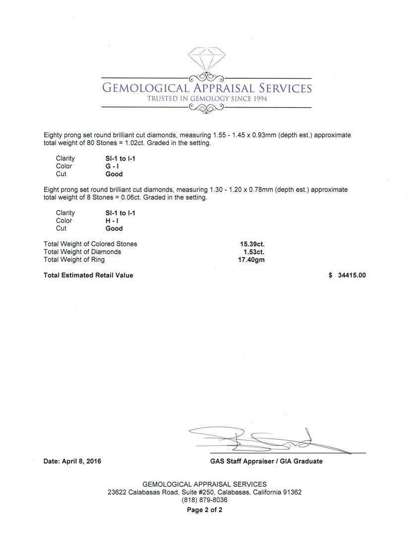 One electronically tested 14KT rose gold lady's cast fashion ring with a basket halo with a bright polish with milgrain detailing finish. The featured lady's ring has a shank measuring 2.88 millimeters wide. Identified with markings of "14K". Condition is new, good workmanship. Containing: One prong set oval modified brilliant cut natural tanzanite, measuring 18.20 x 16.19 x 7.25mm, approximate weight of 15.02ct., clarity is eye clean, type I, medium dark, moderately strong, violetish blue color, (GIA vB 6/4), cut is excellent. Transmitting light with no distortion, transparent. Colored gemstones are presumed to have been subjected to commonly used enhancement processes. Graded in the setting. Two bezel set round modified brilliant cut natural blue sapphires, measuring 3.20 - 3.10 x 2.05 mm, 5%. bulge factor, approximate total weight of 0.37ct., clarity is eye clean, type II, medium dark, strong, violetish blue color, (GIA vB 6/5), cut is very good. Transmitting light with no distortion, transparent. Colored gemstones are presumed to have been subjected to commonly used enhancement processes. Graded in the setting. Two bezel set round brilliant cut diamonds, measuring 3.60 - 3.50 x 2.20mm (depth est.) approximate total weight of 2 Stones = 0.35ct. Graded in the setting. Clarity: SI-1 to SI-2. Color: H - I. Cut Very Good Two prong set round brilliant cut diamonds, measuring 2.40 - 2.35 x 1.45mm (depth est.) approximate total weight of 2 Stones = 0.10ct. Graded in the setting. Clarity: SI-1 to I-1. Color: G - Very Good Eighty prong set round brilliant cut diamonds, measuring 1.55 - 1.45 x 0.93mm (depth est.) approximate total weight of 80 Stones = 1.02ct. Graded in the setting. Clarity: SI-1 to I-1. Color: G - I. Cut Good Eight prong set round brilliant cut diamonds, measuring 1.30 - 1.20 x 0.78mm (depth est.) approximate total weight of 8 Stones = 0.06ct. Graded in the setting. Clarity: SI-1 to I-1. Color: H - I. Cut Good. Total Weight of Colored Stones 15.39ct. Total Weight of Diamonds 1.53ct. Total Weight of Ring 17.40gm. GAS Appraised.