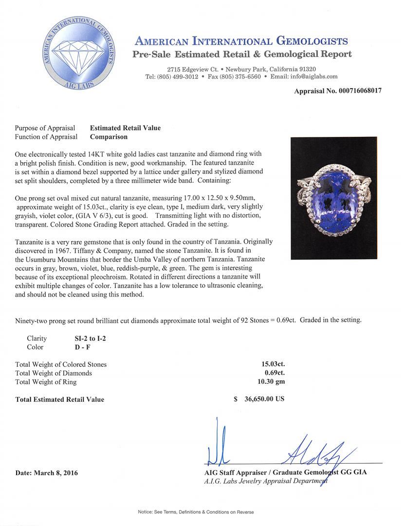 One electronically tested 14KT white gold ladies cast tanzanite and diamond ring with a bright polish finish. The featured tanzanite is set within a diamond bezel supported by a lattice under gallery and stylized diamond set split shoulders, completed by a three millimeter wide band. Condition is new, good workmanship. Containing: One prong set oval mixed cut natural tanzanite, measuring 17.00 x 12.50 x 9.50mm, approximate weight of 15.03ct., clarity is eye clean, type I, medium dark, very slightly grayish, violet color, (GIA V 6/3), cut is good. Transmitting light with no distortion, transparent. Colored Stone Grading Report attached. Graded in the setting. Tanzanite is a very rare gemstone that is only found in the country of Tanzania. Originally discovered in 1967. Tiffany & Company, named the stone Tanzanite. It is found in the Usumburu Mountains that border the Umba Valley of northern Tanzania. Tanzanite occurs in gray, brown, violet, blue, reddish-purple, & green. The gem is interesting because of its exceptional pleochroism. Rotated in different directions a tanzanite will exhibit multiple changes of color. Tanzanite has a low tolerance to ultrasonic cleaning, and should not be cleaned using this method. Ninety-Two prong set round brilliant cut diamonds approximate total weight of 92 Stones = 0.69ct. Graded in the setting. Clarity: SI-2 to I-2. Color: D - F. Total Weight of Colored Stones 15.03ct. Total Weight of Diamonds 0.69ct. Total Weight of Ring 10.30gm. AIG Appraised at $36,650.00.