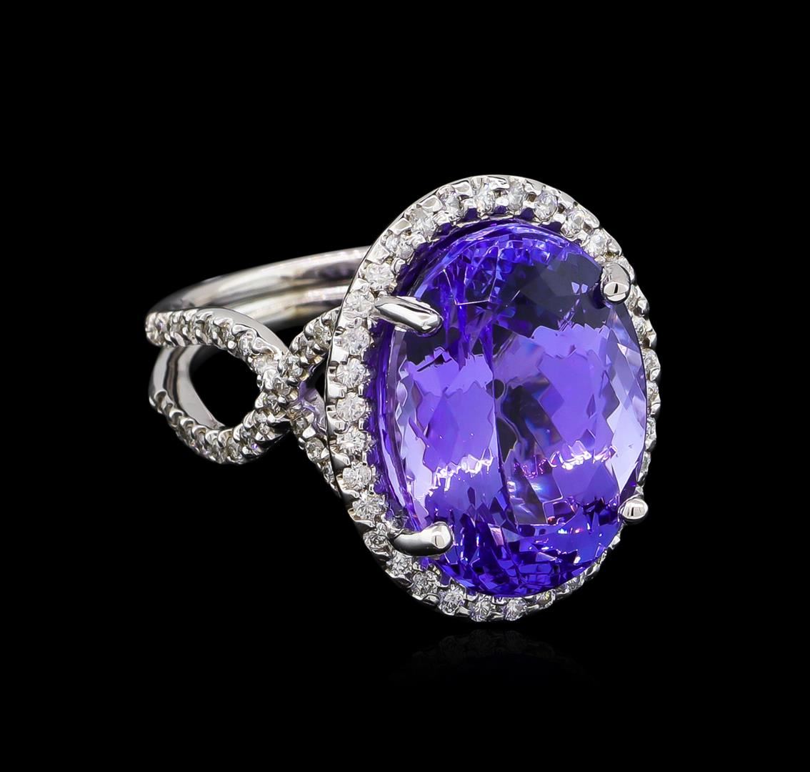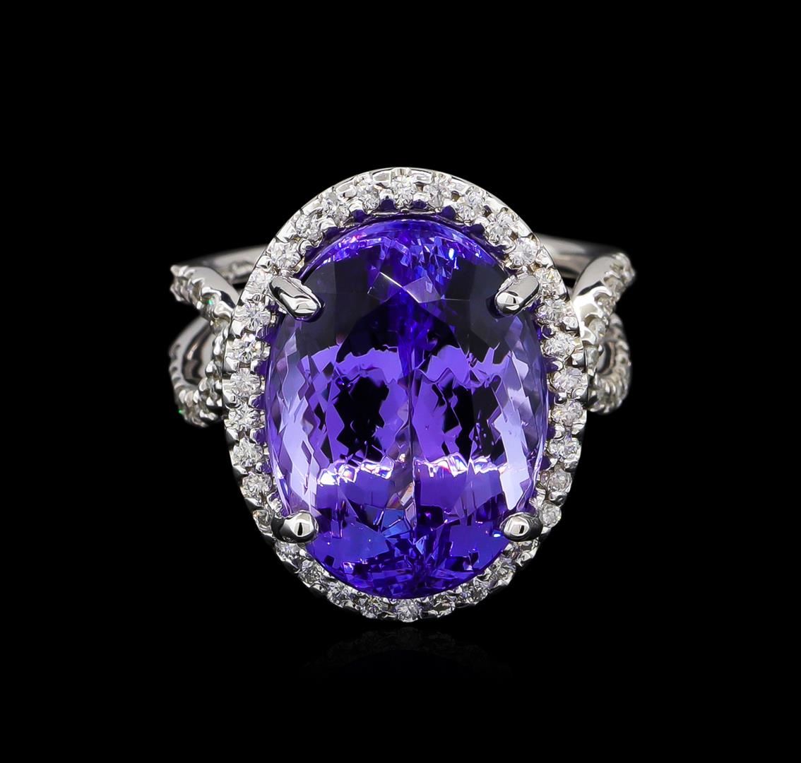 One electronically tested 14KT white gold ladies cast tanzanite and diamond ring with a bright polish finish. The featured tanzanite is set within a diamond bezel supported by a lattice under gallery and stylized diamond set split shoulders, completed by a three millimeter wide band. Condition is new, good workmanship. Containing: One prong set oval mixed cut natural tanzanite, measuring 17.00 x 12.50 x 9.50mm, approximate weight of 15.03ct., clarity is eye clean, type I, medium dark, very slightly grayish, violet color, (GIA V 6/3), cut is good. Transmitting light with no distortion, transparent. Colored Stone Grading Report attached. Graded in the setting. Tanzanite is a very rare gemstone that is only found in the country of Tanzania. Originally discovered in 1967. Tiffany & Company, named the stone Tanzanite. It is found in the Usumburu Mountains that border the Umba Valley of northern Tanzania. Tanzanite occurs in gray, brown, violet, blue, reddish-purple, & green. The gem is interesting because of its exceptional pleochroism. Rotated in different directions a tanzanite will exhibit multiple changes of color. Tanzanite has a low tolerance to ultrasonic cleaning, and should not be cleaned using this method. Ninety-Two prong set round brilliant cut diamonds approximate total weight of 92 Stones = 0.69ct. Graded in the setting. Clarity: SI-2 to I-2. Color: D - F. Total Weight of Colored Stones 15.03ct. Total Weight of Diamonds 0.69ct. Total Weight of Ring 10.30gm. AIG Appraised at $36,650.00.
