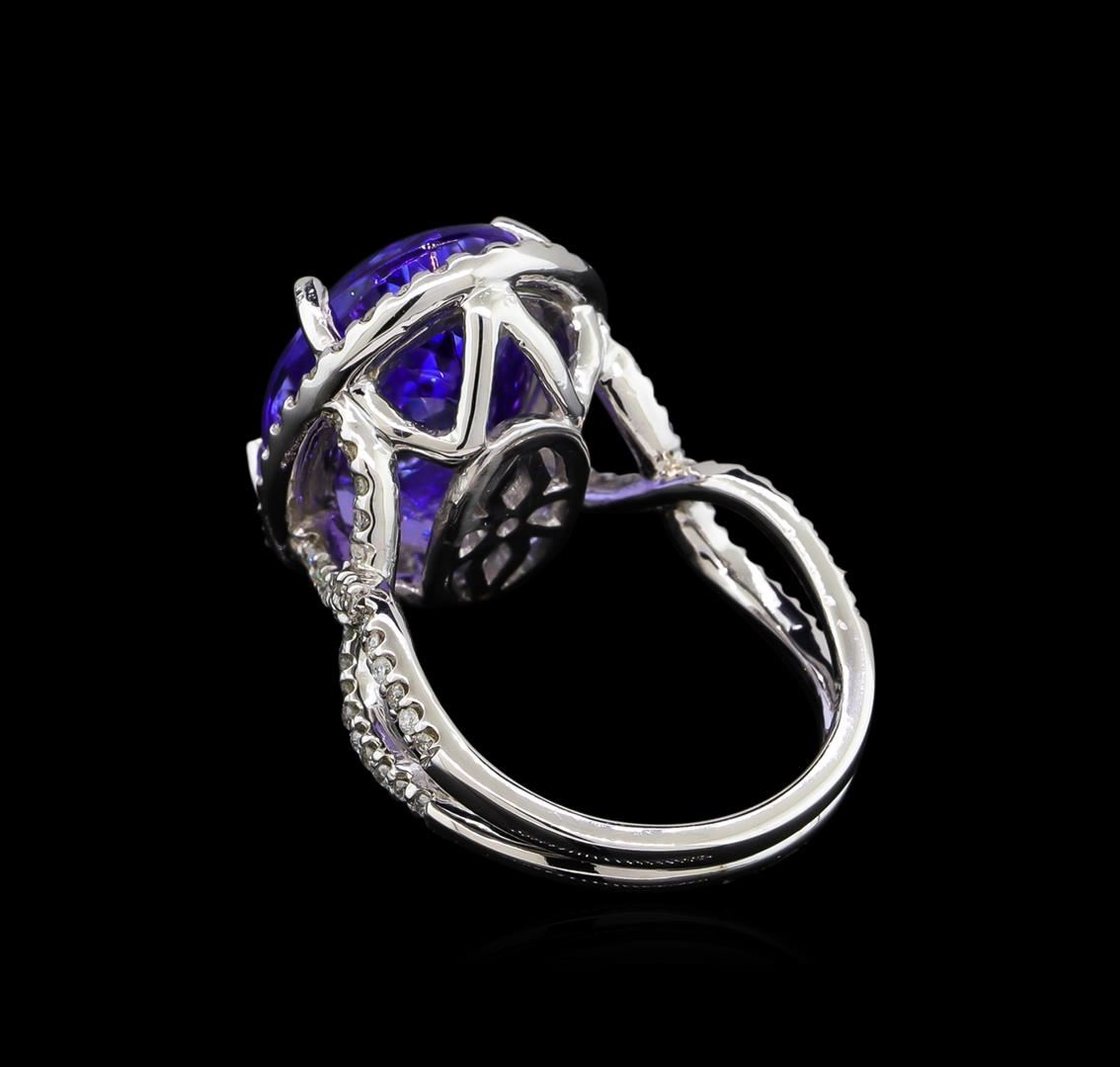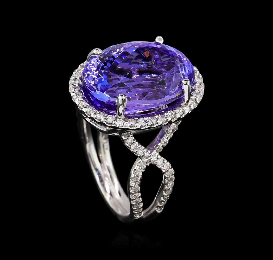 One electronically tested 14KT white gold ladies cast tanzanite and diamond ring with a bright polish finish. The featured tanzanite is set within a diamond bezel supported by a lattice under gallery and stylized diamond set split shoulders, completed by a three millimeter wide band. Condition is new, good workmanship. Containing: One prong set oval mixed cut natural tanzanite, measuring 17.00 x 12.50 x 9.50mm, approximate weight of 15.03ct., clarity is eye clean, type I, medium dark, very slightly grayish, violet color, (GIA V 6/3), cut is good. Transmitting light with no distortion, transparent. Colored Stone Grading Report attached. Graded in the setting. Tanzanite is a very rare gemstone that is only found in the country of Tanzania. Originally discovered in 1967. Tiffany & Company, named the stone Tanzanite. It is found in the Usumburu Mountains that border the Umba Valley of northern Tanzania. Tanzanite occurs in gray, brown, violet, blue, reddish-purple, & green. The gem is interesting because of its exceptional pleochroism. Rotated in different directions a tanzanite will exhibit multiple changes of color. Tanzanite has a low tolerance to ultrasonic cleaning, and should not be cleaned using this method. Ninety-Two prong set round brilliant cut diamonds approximate total weight of 92 Stones = 0.69ct. Graded in the setting. Clarity: SI-2 to I-2. Color: D - F. Total Weight of Colored Stones 15.03ct. Total Weight of Diamonds 0.69ct. Total Weight of Ring 10.30gm. AIG Appraised at $36,650.00.