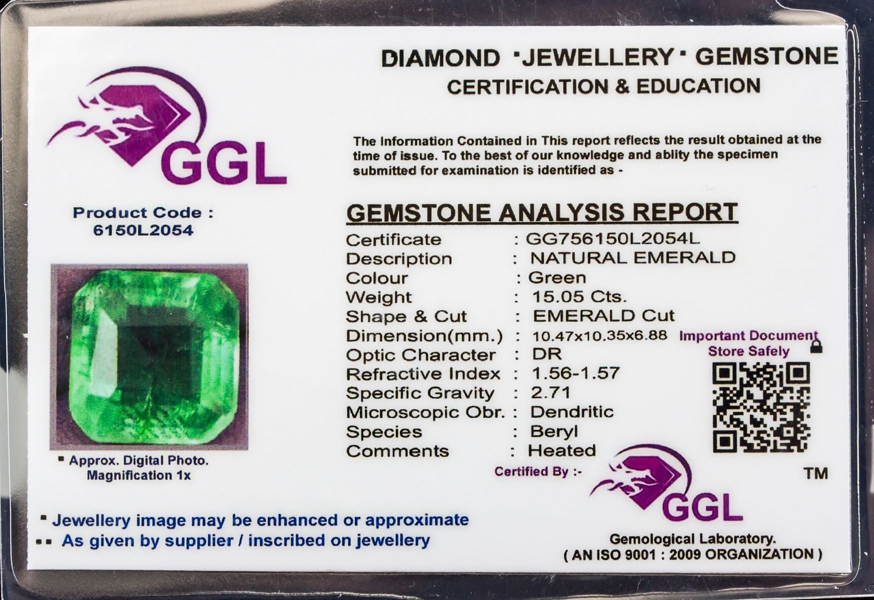 Natural green emerald. Emerald cut. Wiht GGL certificate. 10.47 x 10.35 x 6.88 mm, 15.05 ct
