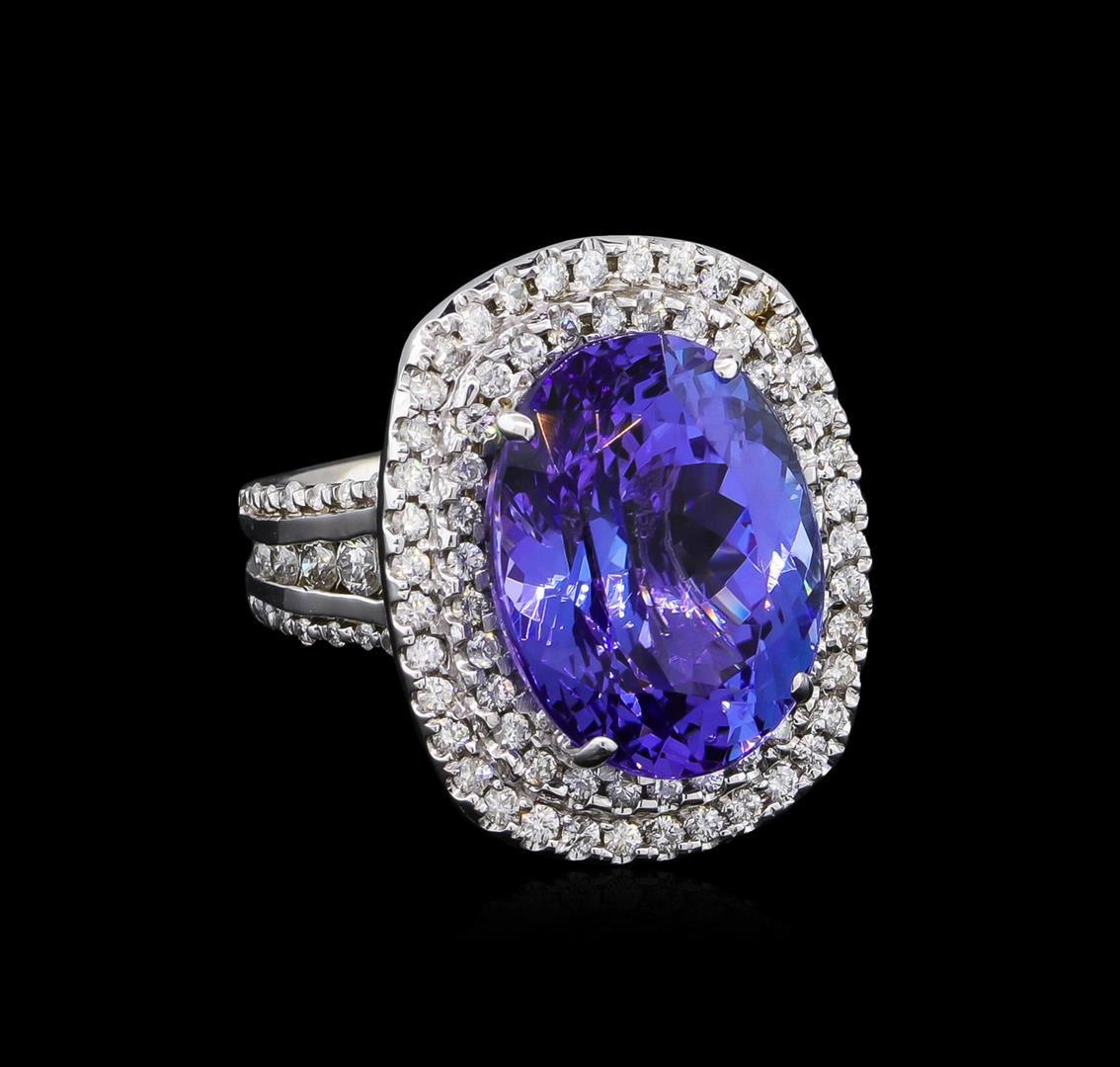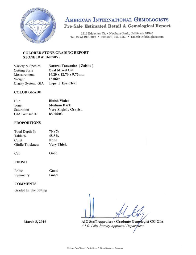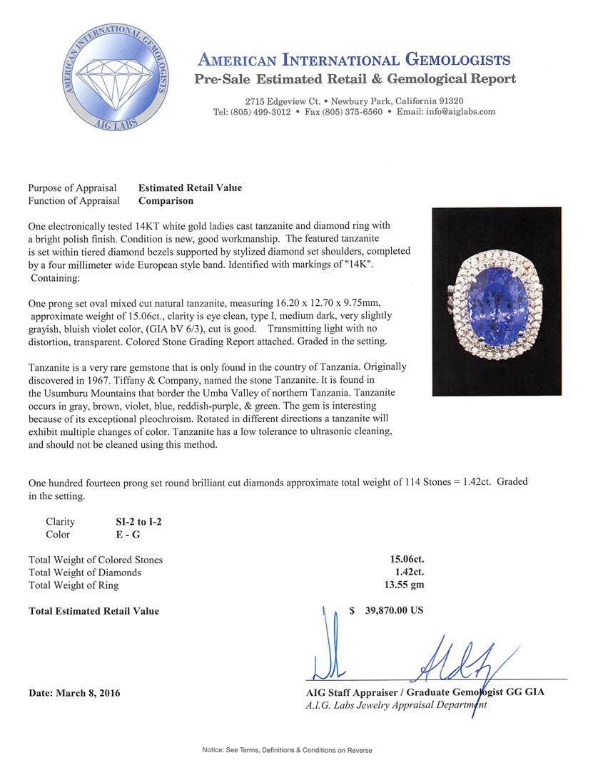 One electronically tested 14KT white gold ladies cast tanzanite and diamond ring with a bright polish finish. The featured tanzanite is set within tiered diamond bezels supported by stylized diamond set shoulders, completed by a four millimeter wide European style band. Identified with markings of "14K". Condition is new, good workmanship. Containing: One prong set oval mixed cut natural tanzanite, measuring 16.20 x 12.70 x 9.75mm, approximate weight of 15.06ct., clarity is eye clean, type I, medium dark, very slightly grayish, bluish violet color, (GIA bV 6/3), cut is good. Transmitting light with no distortion, transparent. Colored Stone Grading Report attached. Graded in the setting. Tanzanite is a very rare gemstone that is only found in the country of Tanzania. Originally discovered in 1967. Tiffany & Company, named the stone Tanzanite. It is found in the Usumburu Mountains that border the Umba Valley of northern Tanzania. Tanzanite occurs in gray, brown, violet, blue, reddish-purple, & green. The gem is interesting because of its exceptional pleochroism. Rotated in different directions a tanzanite will exhibit multiple changes of color. Tanzanite has a low tolerance to ultrasonic cleaning, and should not be cleaned using this method. One Hundred Fourteen prong set round brilliant cut diamonds approximate total weight of 114 Stones = 1.42ct. Graded in the setting. Clarity: SI-2 to I-2. Color: E - G. Total Weight of Colored Stones 15.06ct. Total Weight of Diamonds 1.42ct. Total Weight of Ring 13.55gm. AIG Appraised at $39,870.00.