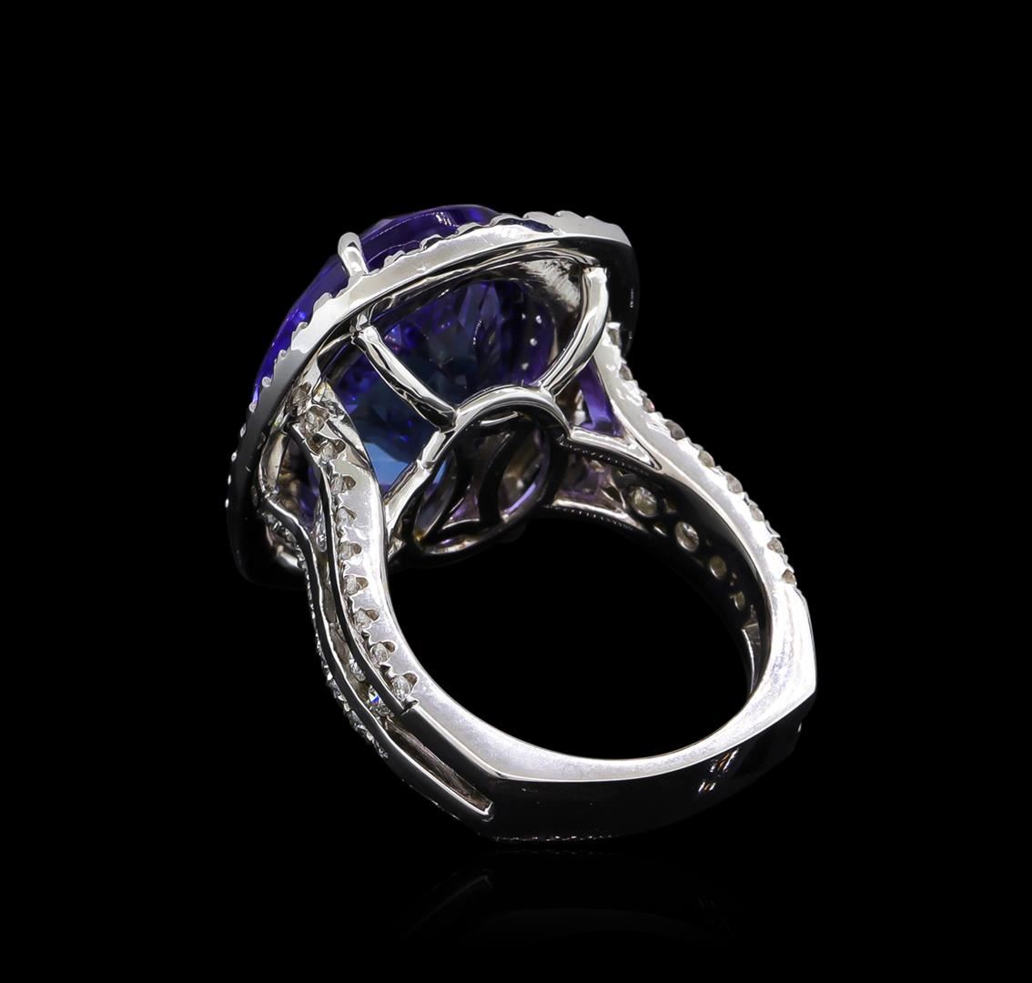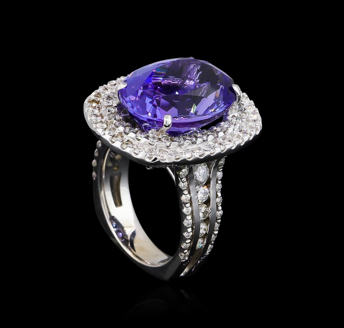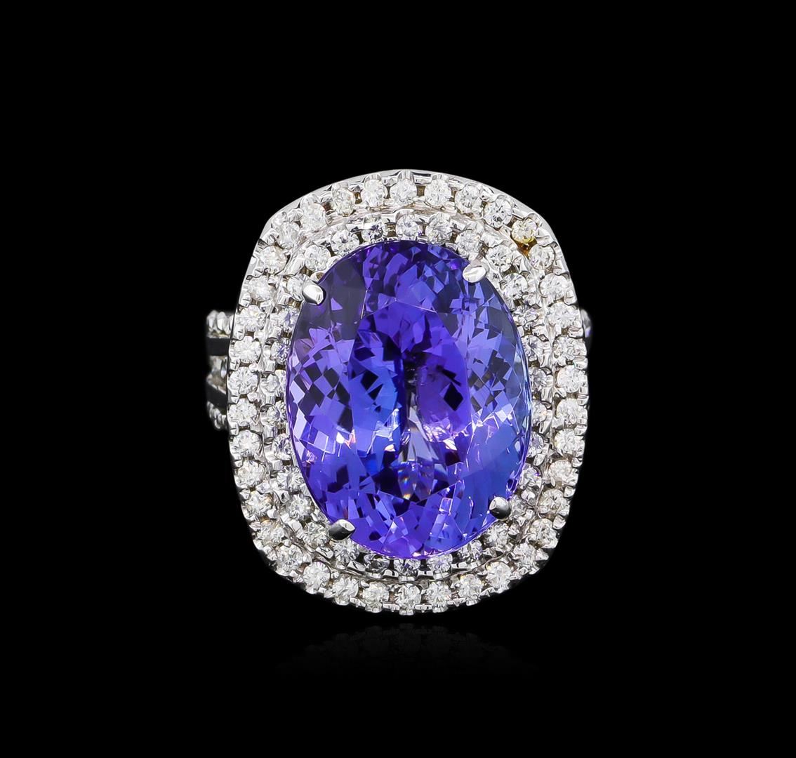 One electronically tested 14KT white gold ladies cast tanzanite and diamond ring with a bright polish finish. The featured tanzanite is set within tiered diamond bezels supported by stylized diamond set shoulders, completed by a four millimeter wide European style band. Identified with markings of "14K". Condition is new, good workmanship. Containing: One prong set oval mixed cut natural tanzanite, measuring 16.20 x 12.70 x 9.75mm, approximate weight of 15.06ct., clarity is eye clean, type I, medium dark, very slightly grayish, bluish violet color, (GIA bV 6/3), cut is good. Transmitting light with no distortion, transparent. Colored Stone Grading Report attached. Graded in the setting. Tanzanite is a very rare gemstone that is only found in the country of Tanzania. Originally discovered in 1967. Tiffany & Company, named the stone Tanzanite. It is found in the Usumburu Mountains that border the Umba Valley of northern Tanzania. Tanzanite occurs in gray, brown, violet, blue, reddish-purple, & green. The gem is interesting because of its exceptional pleochroism. Rotated in different directions a tanzanite will exhibit multiple changes of color. Tanzanite has a low tolerance to ultrasonic cleaning, and should not be cleaned using this method. One Hundred Fourteen prong set round brilliant cut diamonds approximate total weight of 114 Stones = 1.42ct. Graded in the setting. Clarity: SI-2 to I-2. Color: E - G. Total Weight of Colored Stones 15.06ct. Total Weight of Diamonds 1.42ct. Total Weight of Ring 13.55gm. AIG Appraised at $39,870.00.