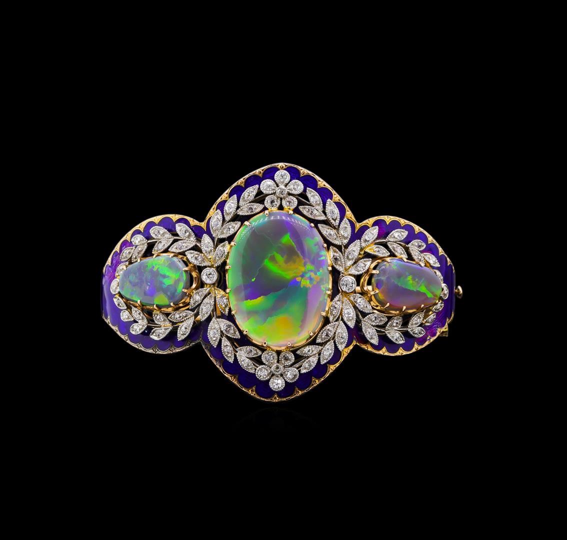 One black opal that is cut in a oval shaped cabochon and is prong set, measuring 25.20 mm long x 18.50 mm wide, and 3.70 mm thick and the approximate weight is 10.76 carats. The opal has a bright, green-blue play of color (fire) in a broad flashfire pattern; a low dome; a good cut; slightly included; consistent in its brightness and pattern; and is slightly directional. Graded in the setting. Two black opals that are cut in a freeform shaped cabochon and are prong set, measuring 11.00 mm long x 9.00 mm wide, and 2.70 mm thick and the approximate weight is 4.32 carats. The opals have a bright, green-blue play of color (fire) in a broad flashfire pattern; a low dome; a good cut; slightly included; consistent in their brightness and pattern; and are slightly directional. Color & clarity grade are an average for the pair. Graded in the setting. Four bezel set transitional cut diamonds, measuring 2.50 - 2.50 x 1.55mm (depth est.) approximate total weight of 4 Stones = 0.33ct. Graded in the setting. Clarity: SI-1 to SI-2. Color: G - H Seventy-Six bead set single cut diamonds, measuring 1.80 - 1.70 x 1.09mm (depth est.) approximate total weight of 76 Stones = 1.67ct. Graded in the setting. Clarity: SI-1 to SI-2. Color: G - I. Total Weight of Diamonds 2.00ct. Total Weight of Opals 15.08ct. Total Weight of Bangle Bracelet 47.86gm. AIG Appraised at $21,720.00.