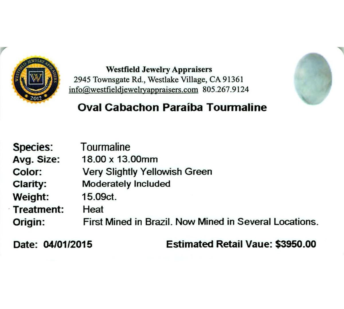 One oval cabochon cut natural Paraiba tourmaline exact weight 15.09ct., clarity is moderately included, cut is good. Westfield Appraised at $3,950.00.