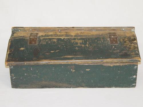 15 1/2" 19TH CENT. WOODEN SLANT LID LOCKING CANDLE BOX IN GREEN PAINT W/ TOP HINGED LID - WEAR, PAINT LOSS & IMPERFECTIONS