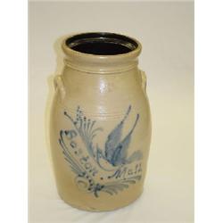 15 1/2" BUTTERCHURN W/ COBALT BLUEBIRD & BRANCHES SCRIPT BOSTON MASS - RIM CHIP REPAIRS & PITTING REPAIRS AROUND BASE