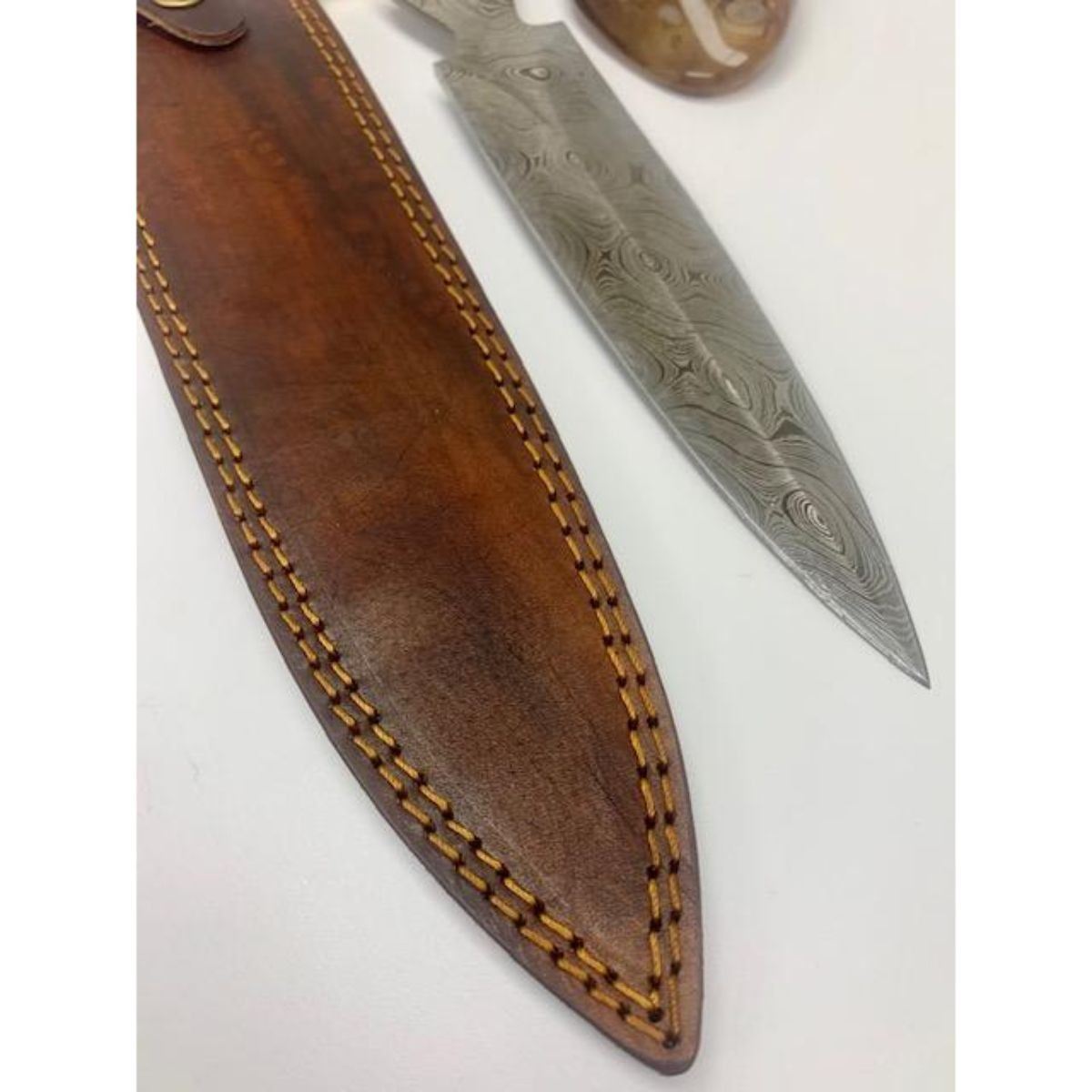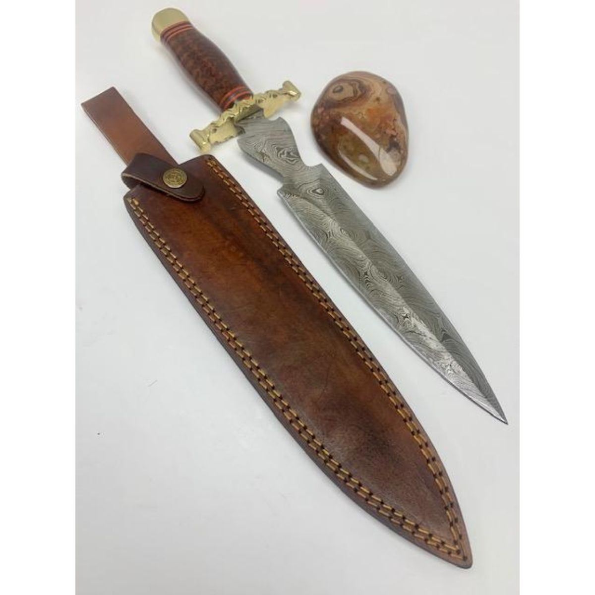 15 1/2" Brass & Wooden Handled Damascus Shive Sword With Stitched Leather Sheath An Excellent Hand Crafted Shive To Add To Any Collection. High Quality steel is utilized to forge the finest product in the world. Unique Custom Hand-Forged Damascus Steel Shive Sword Blade Construction: Colored Wood and Brass Spacers. Blade Construction: This superbly designed Marquetry Worked Wood Handle Damascus Shive Sword is Fully Hand Made & Designed. The Blade is crafted by hand forging 216 Layers of 1095 and 15N20 high carbon tool steels, with Nickle layer. Blade has been given excellent heat treatment to get a 56 to 57 HRC. Blade has a razor sharp edge. Sheath Construction: High Quality Thick Genuine Stitched Leather Total Length: 15 1/2" Length View Photos For Further Details