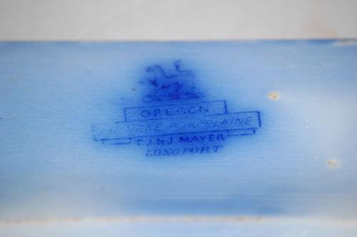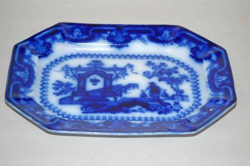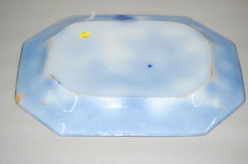 15 1/2" FLOW BLUE IRONSTONE PLATTER - OREGON PATTERN FLOW BLUE IRONSTONE PLATTER BY T.J. & J MAYER (15 1/2" L X 12" W) - STAINS, CRAZING, BACK RIM CHIP, IMPERFECTIONS