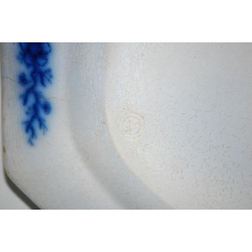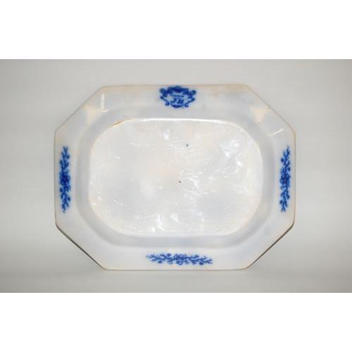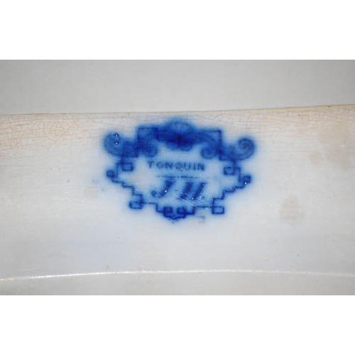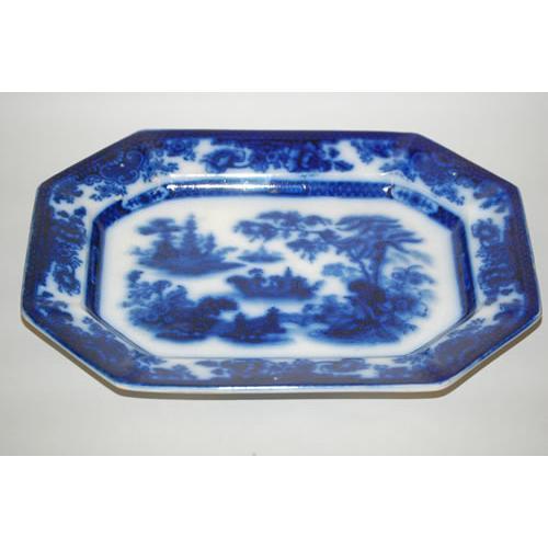 15 1/2" TONQUIN PATTERN FLOW BLUE PLATTER - OCTAGONAL TONQUIN PATTERN FLOW BLUE SERVING PLATER-MARKED TONQUIN J.H. & W/ INCISED MARK (15 1/2" X 12") - WEAR, GLAZE CRAZING & STAIN, 2" RIM HAIRLINE, IMPERFECTIONS